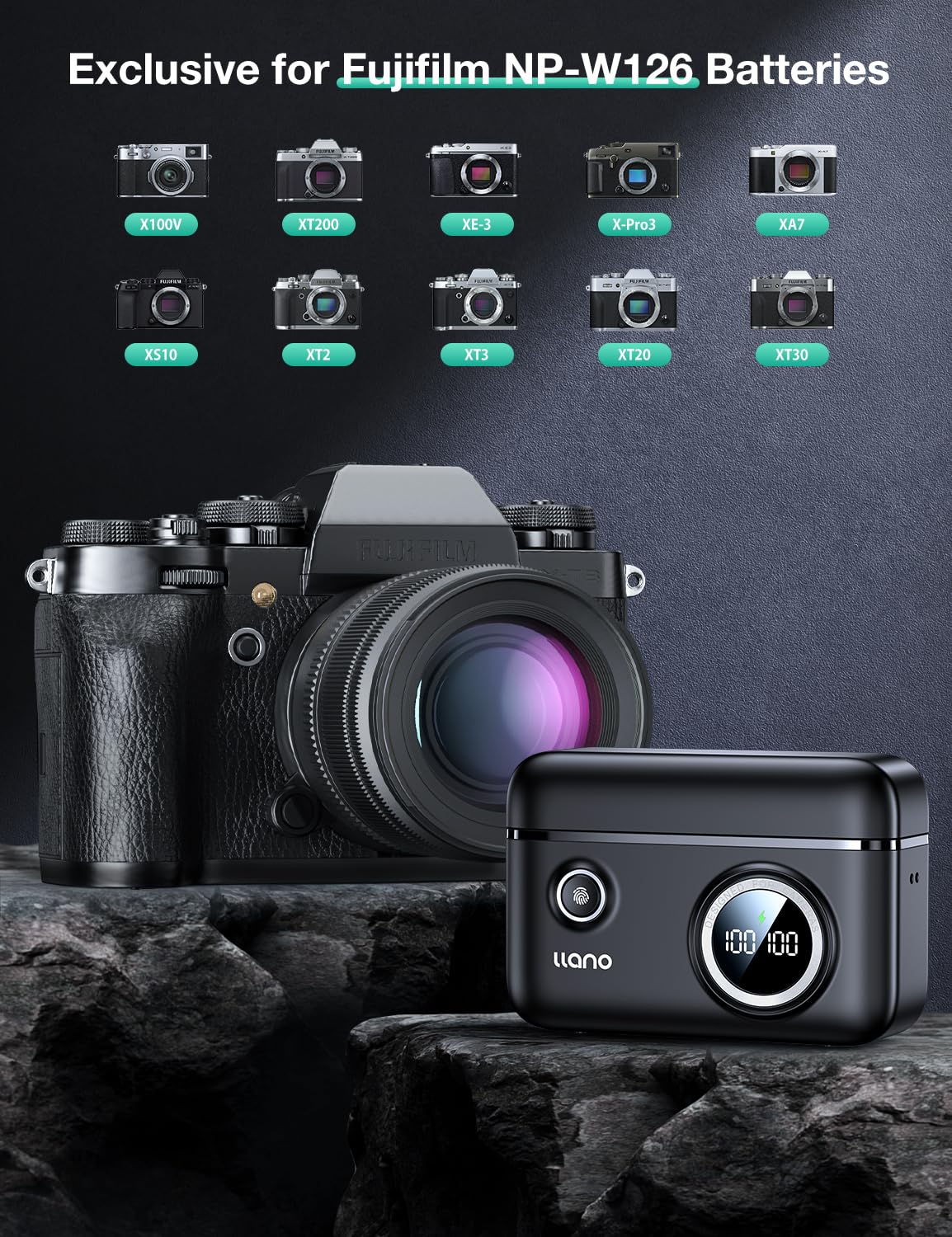 Q: What safety features does the llano charger offer for my camera batteries?A: The llano charger is designed with comprehensive 10-layer safety protection, including safeguards against overcharging, overheating, and short circuits. This ensures that your NP-W126S batteries remain in optimal condition, providing peace of mind during extended photo shoots or video sessions.