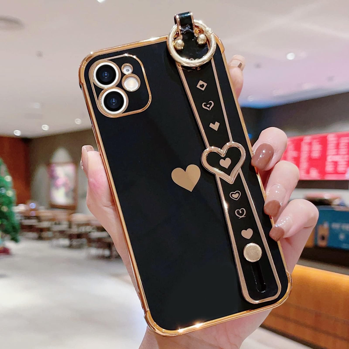 Llz.Coque For Iphone 11 Case Cute Love Heart Plating Strap Phone Cover For Women Girlss Bling Soft Silicone Camera Lens Protecti