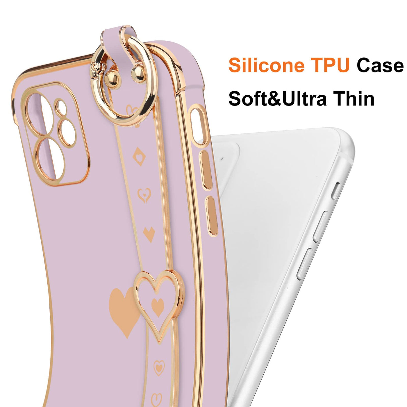 Llz.Coque Iphone 11 Cute Love Heart Case With Wristband, Bling Silicone Bumper, Camera Lens Protection Purple (6.1'')