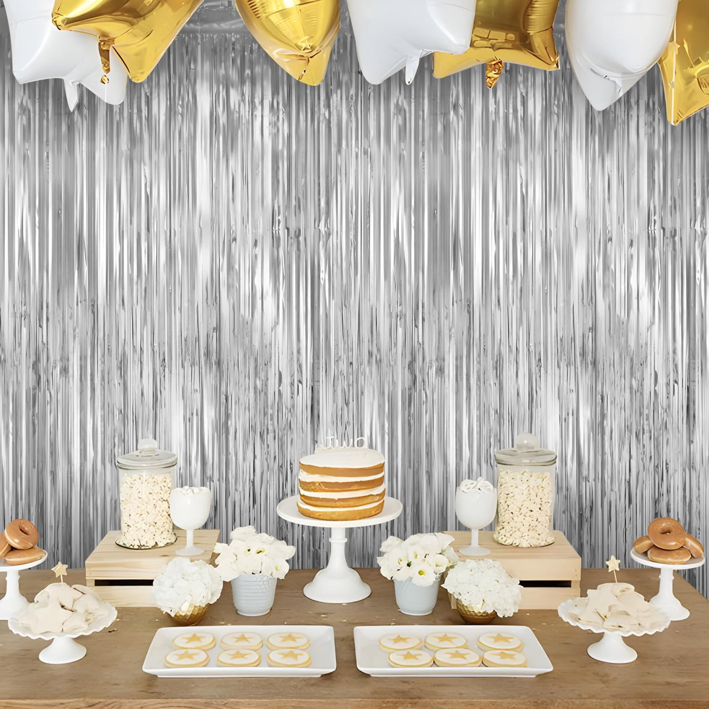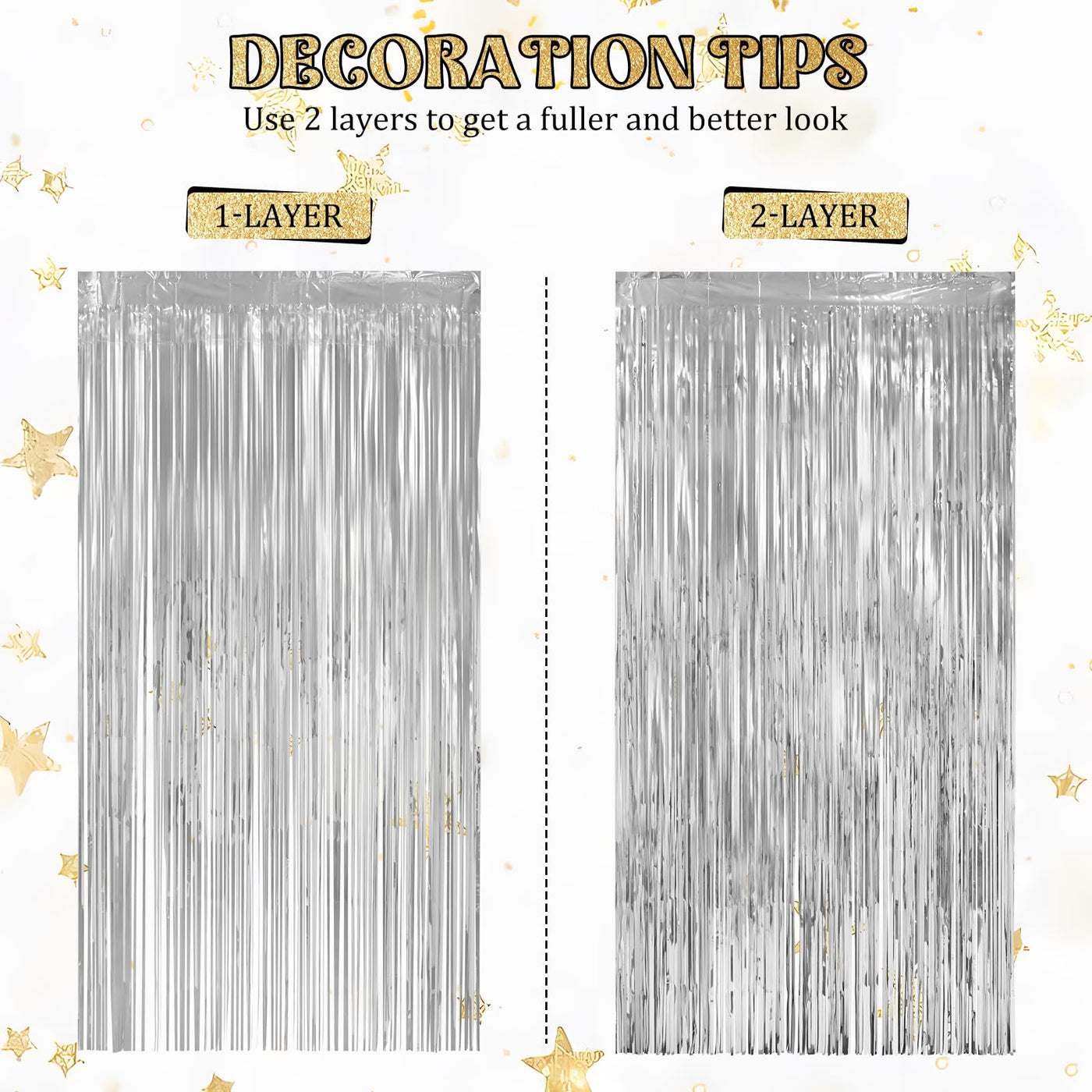 Product: Silver Themed Party Supplies, Disco Party Decorations, Silver Foil Fringe Curtainscolor: Silversize: (Width X Drop) 3.3 X 6.6 Ft Eachapplications: Silver Disco Birthday Party Supplies, Live Streamer Backdrop, Broadcast Streamer Backdrop, Dessert Table Backdrop, Stage Backdrop, Disco Backdrop, Etc.