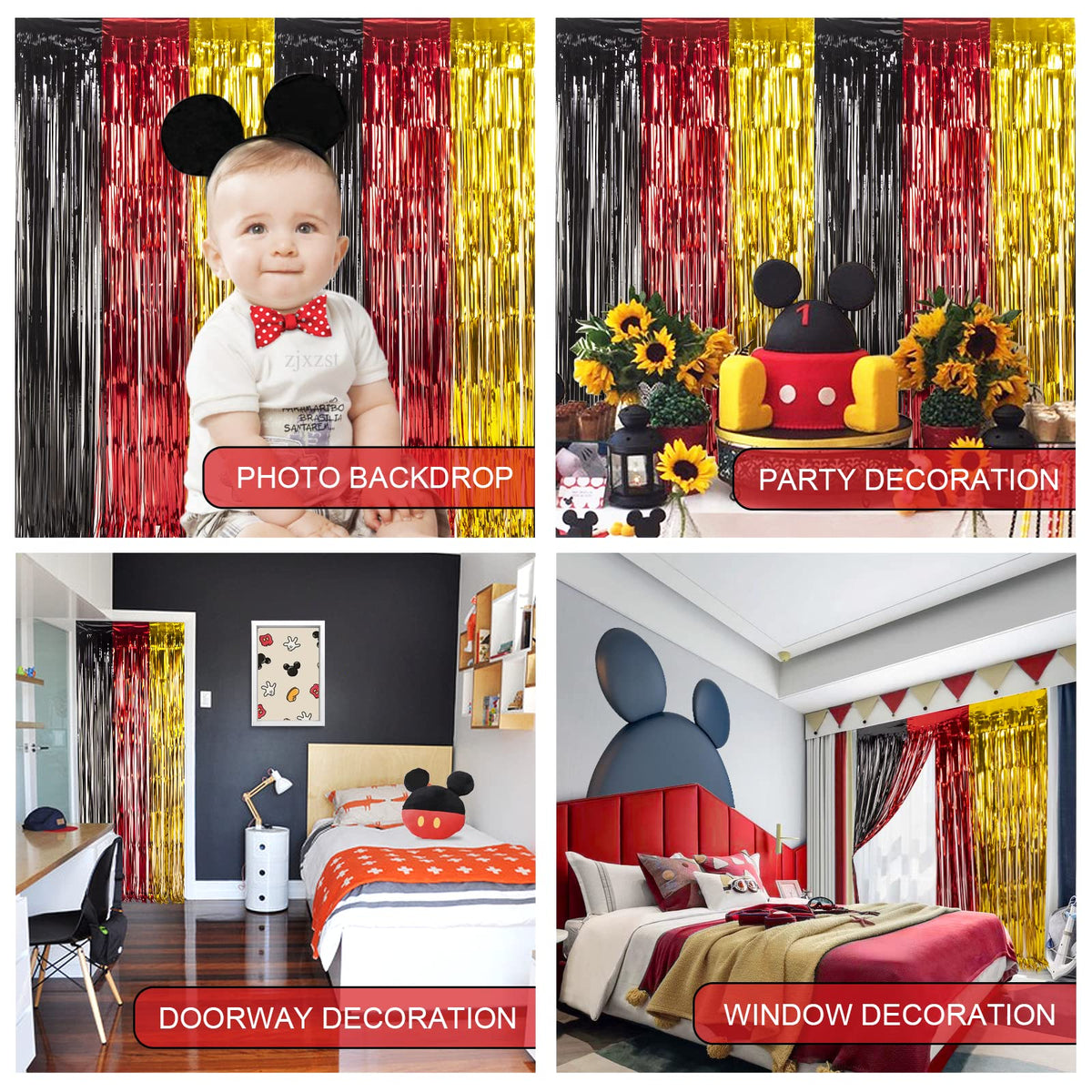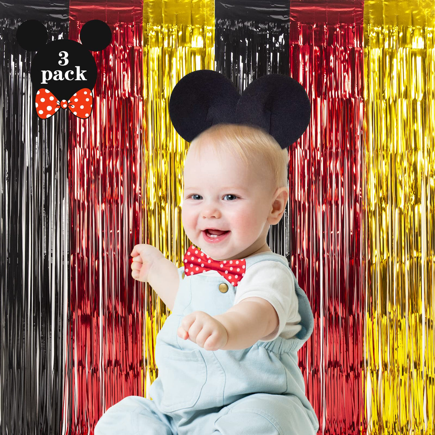 Lolstar 3 Pack Mickey Birthday Party Supplies, 3.3X6.6 Ft Black Red Gold Tinsel Foil Fringe Curtains, Cartoon Mouse Photo Booth