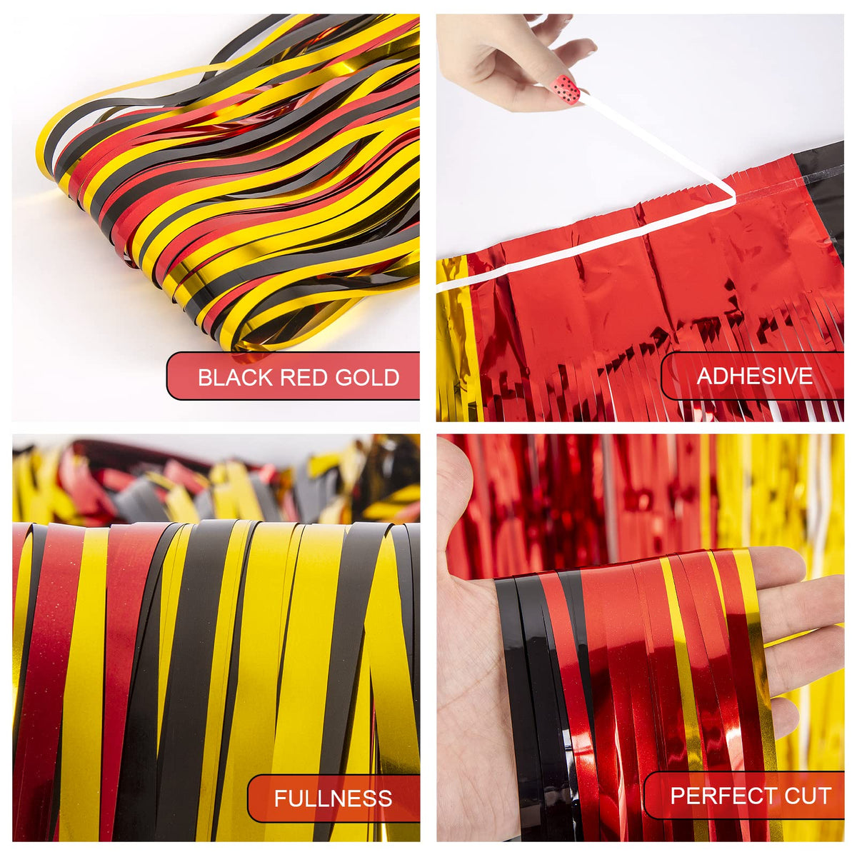 Product : Cartoon Mouse Party Supplies, Cartoon Mouse Party Photo Booth Backdrop, Cartoon Mouse Party Foil Fringe Curtain. Color : Red Black And Gold. Size : 3.3 X 6.6 Ft Each (Width X Drop). Applications: Live Streamer Backdrop, Broadcast Streamer Backdrop, Graduation Party Photo Backdrop, Stage Backdrop, Class Backdrop, Bar Backdrop Decoration Etc.