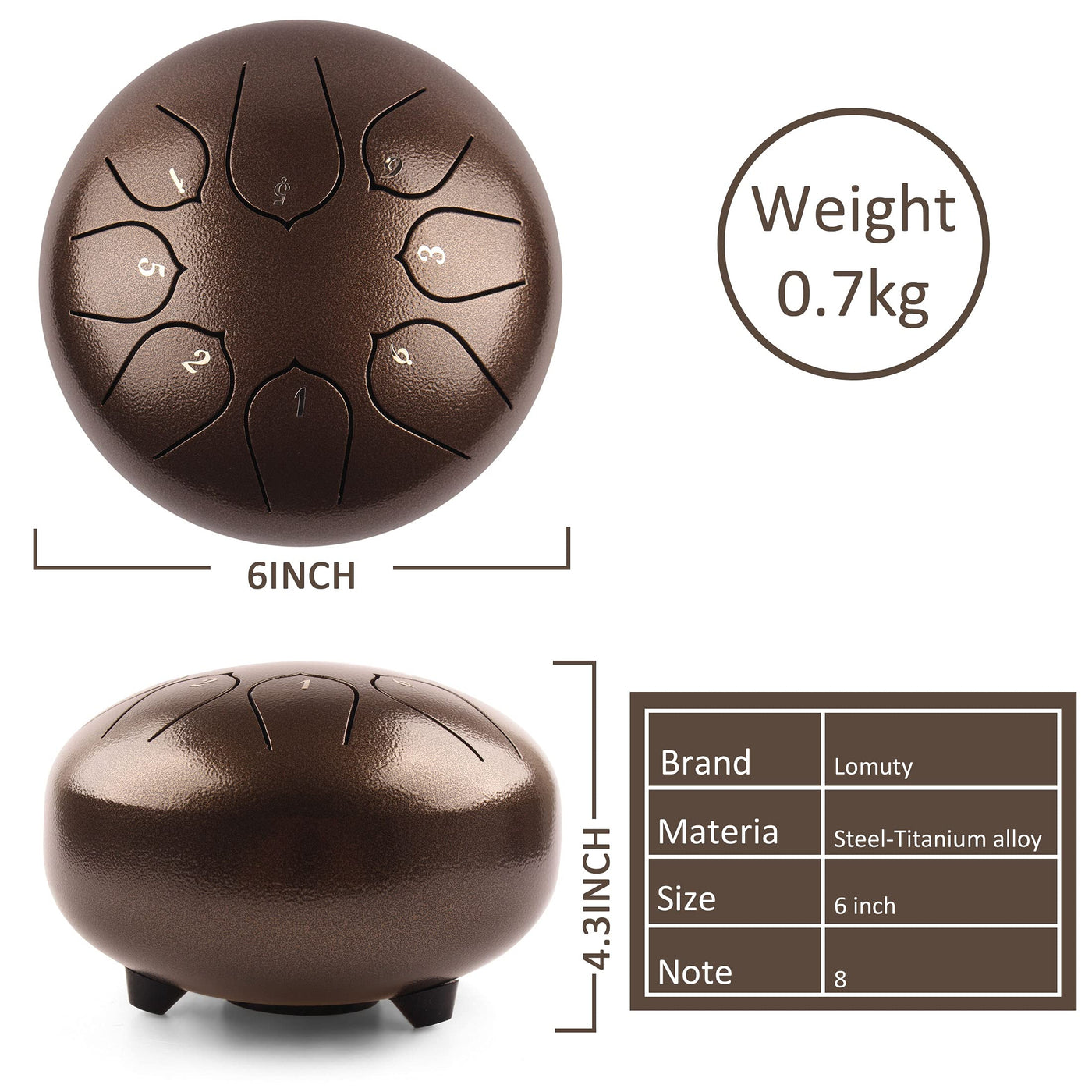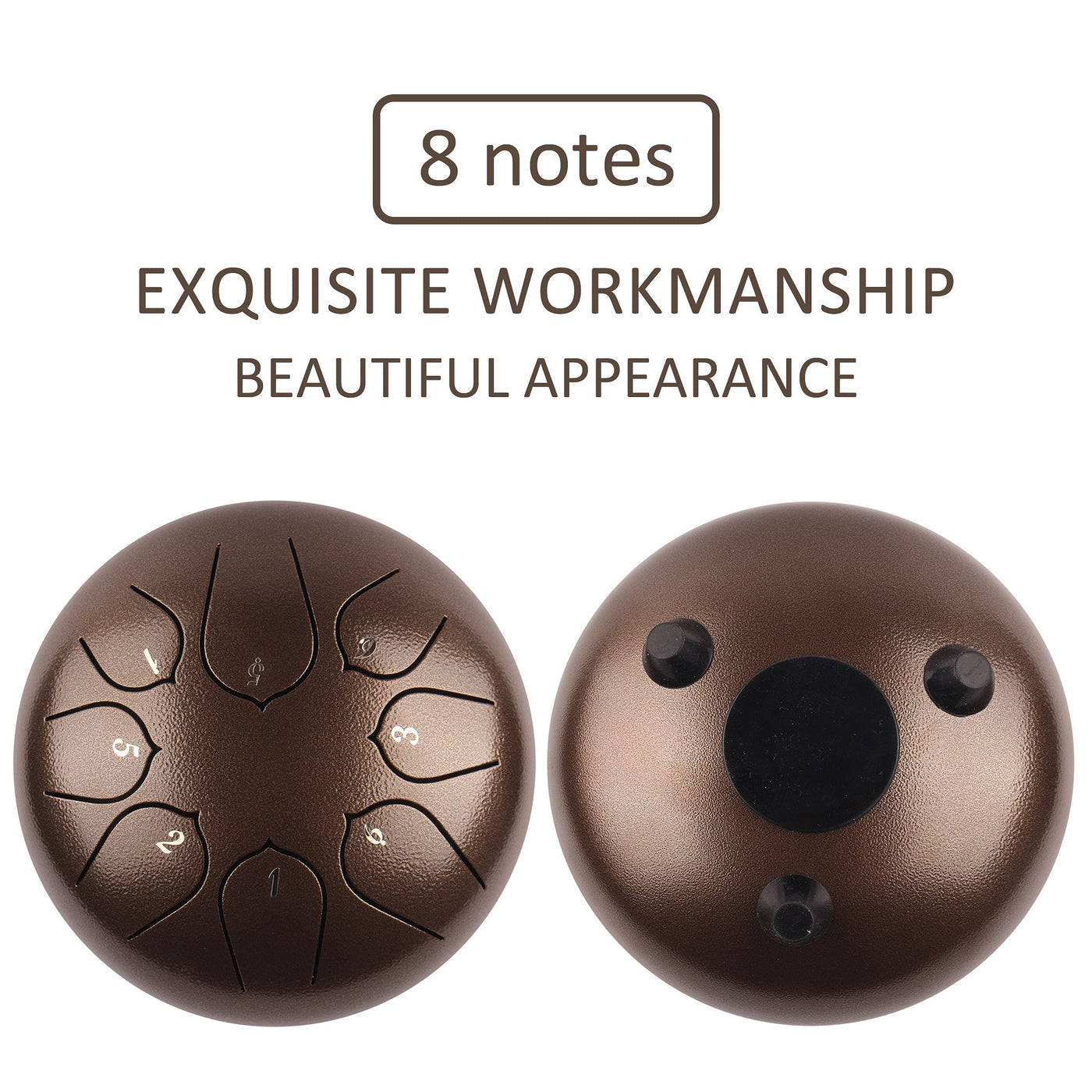 Good Design?Lotus Flower Tongue, It Is Simple In Structure,The Sound Is Very Pleasant And It Is A Kind Of Sound Like Buddha'S Tones.Easy To Learn, Even Beginners Can Easily Master And Play Wonderful Music.Methods Of Enjoying?Playing With Mallets--Hold The Mallet Lightly And Let It Drop And Bounce Off The Note.Playing With Hands--To Achieve The Hand Playing Technique, Use The Pad Of Only One Finger To Strike The Note.Playing With Picks-- Pick Is Another Way To Create The Ideal Tone, If You Are Familiar With Drum, You Can Have A Try.Size? 8Notes6Inch-11.4 X 7.5 X 6.7 Inches,Weight:1.54Lbproducts In The Package? 1 X Steel Drum1 X Pair Of Mallets1 X Music Book1 X Bag1 X Set Of Notes Stickers1 X Set Of Picksq&A:What If The Instrument Out Of The Tune:First Of All,The Steel Drum Is Non-Fixed Instrument,It Is A Normal Phenomenon 10 Points.The Steel Tounge Drum Can Be Adjusted By Fine-Tuning:Pitch Down By Pressing The Tongue For Overtone,Or By Using A File With Grinding To File It Down At The Root Of The Tongue,And The Tone Will Be Lowered; If It Is Low Tone, Please Top Up The Tongue From Its Bottom.