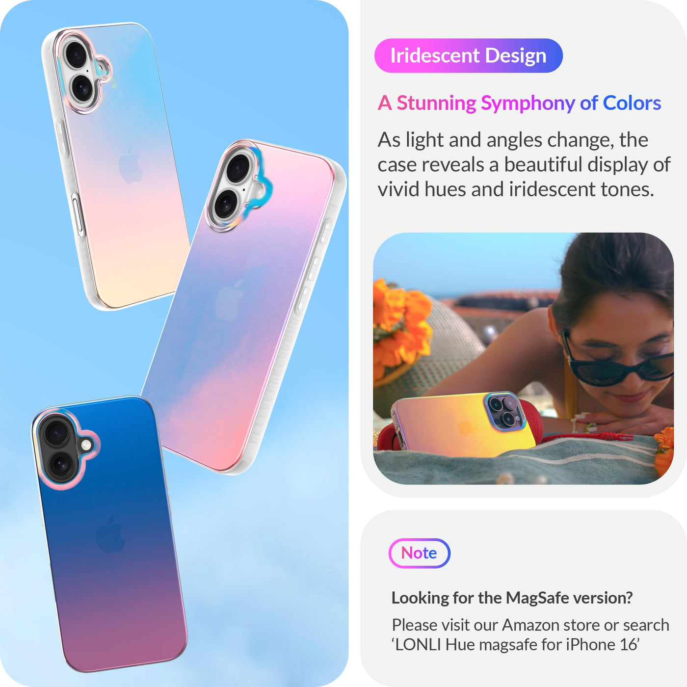 Lonli Hue For Iphone 16 Case Holographic Iridescent Phone Case [360 Shock Absorbent Bumper] Cute, Unique And Aesthetic P