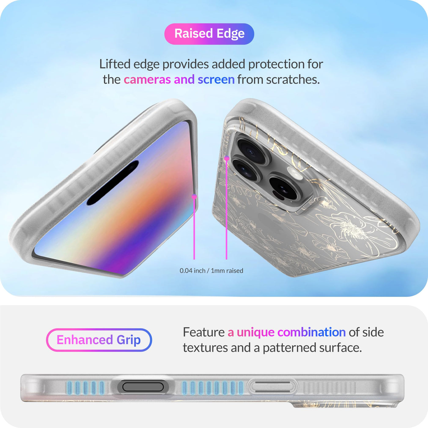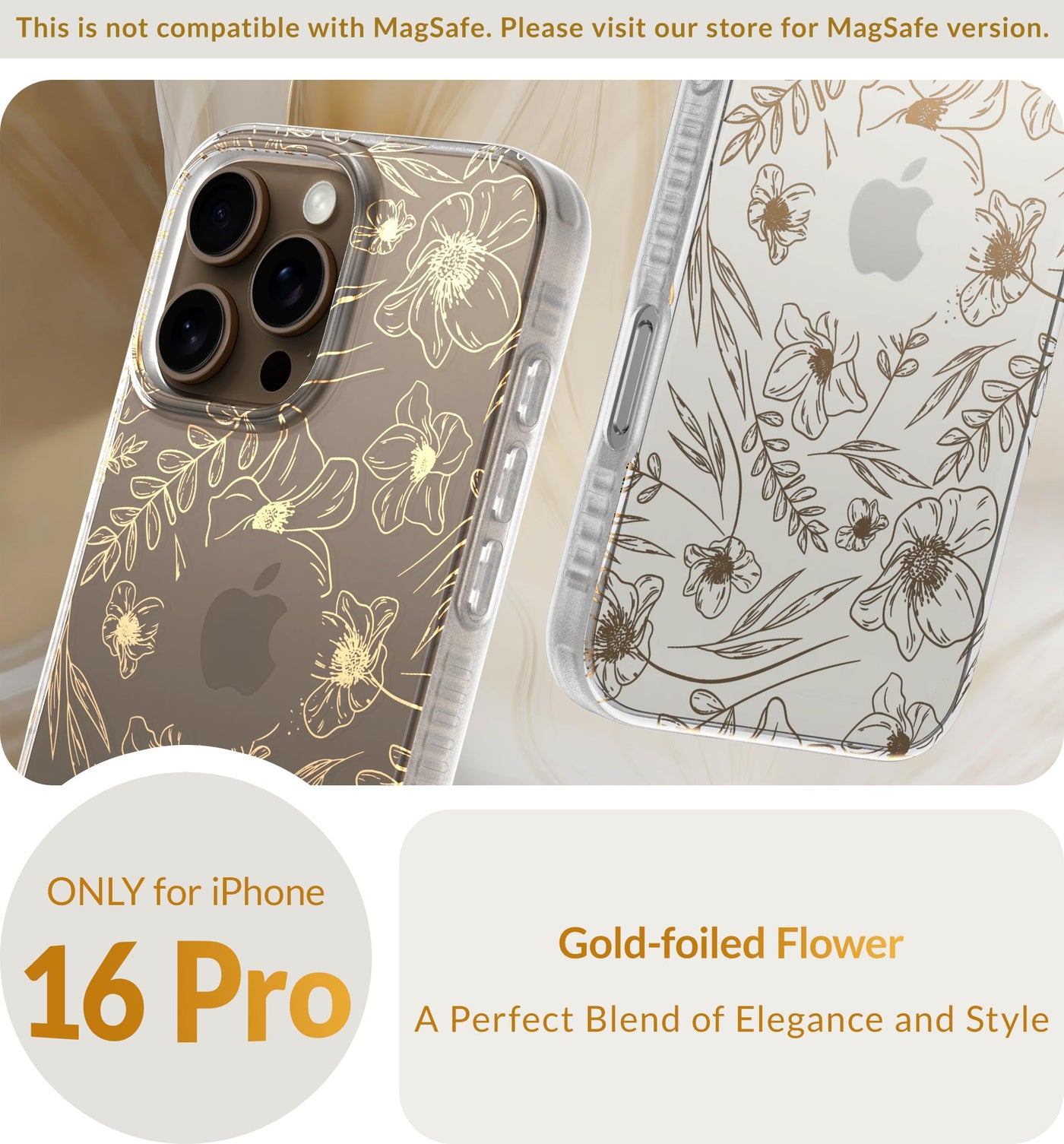 Lonli Hue For Iphone 16 Pro Case Gold Floral Phone Case [360 Shock Absorbent Bumper] Cute, Unique And Aesthetic Phone Co