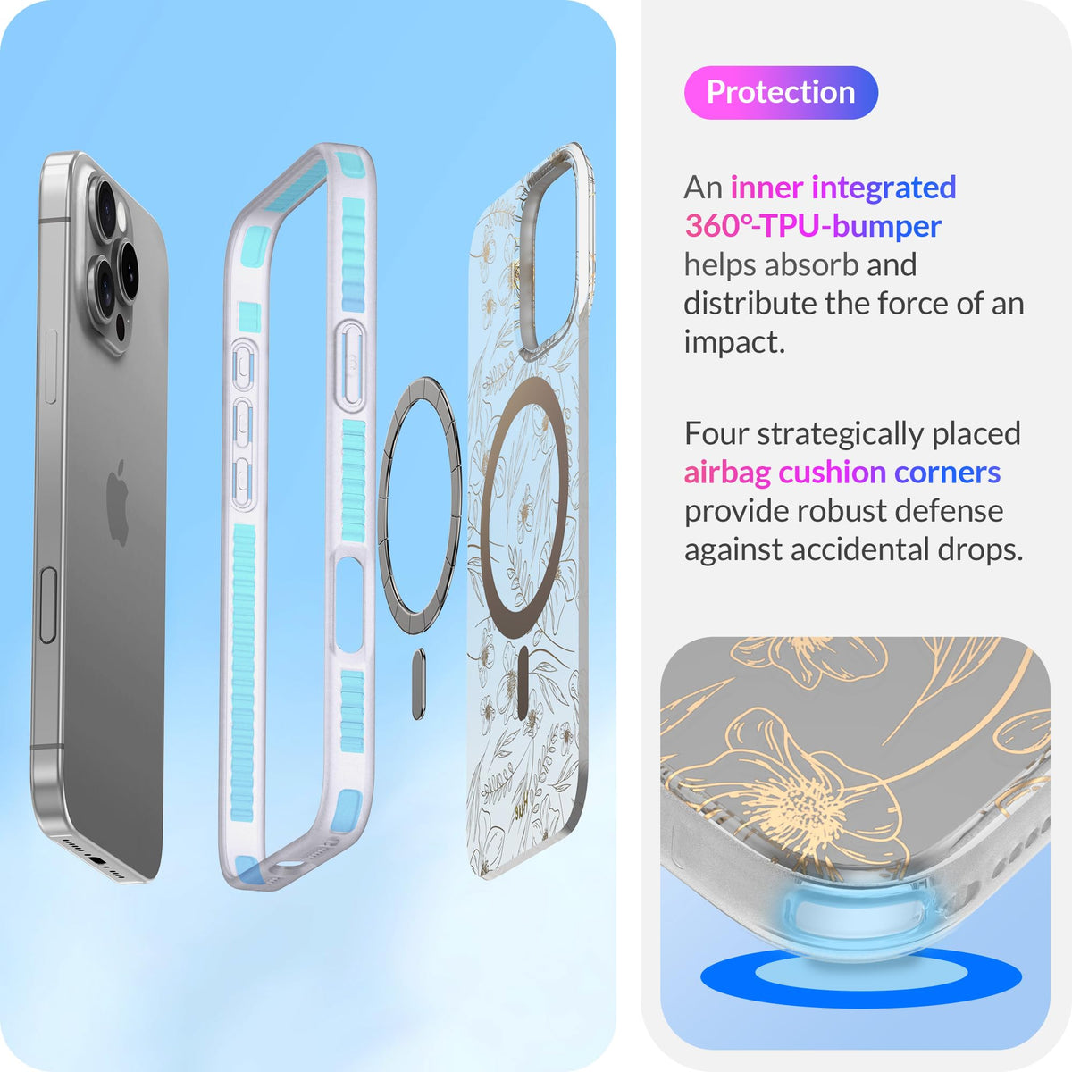 Q: What kind of protection does the case offer?A: The case features a shock-absorbing bumper that protects your iPhone from drops of up to 10 feet, along with raised edges to safeguard the camera and screen from scratches.