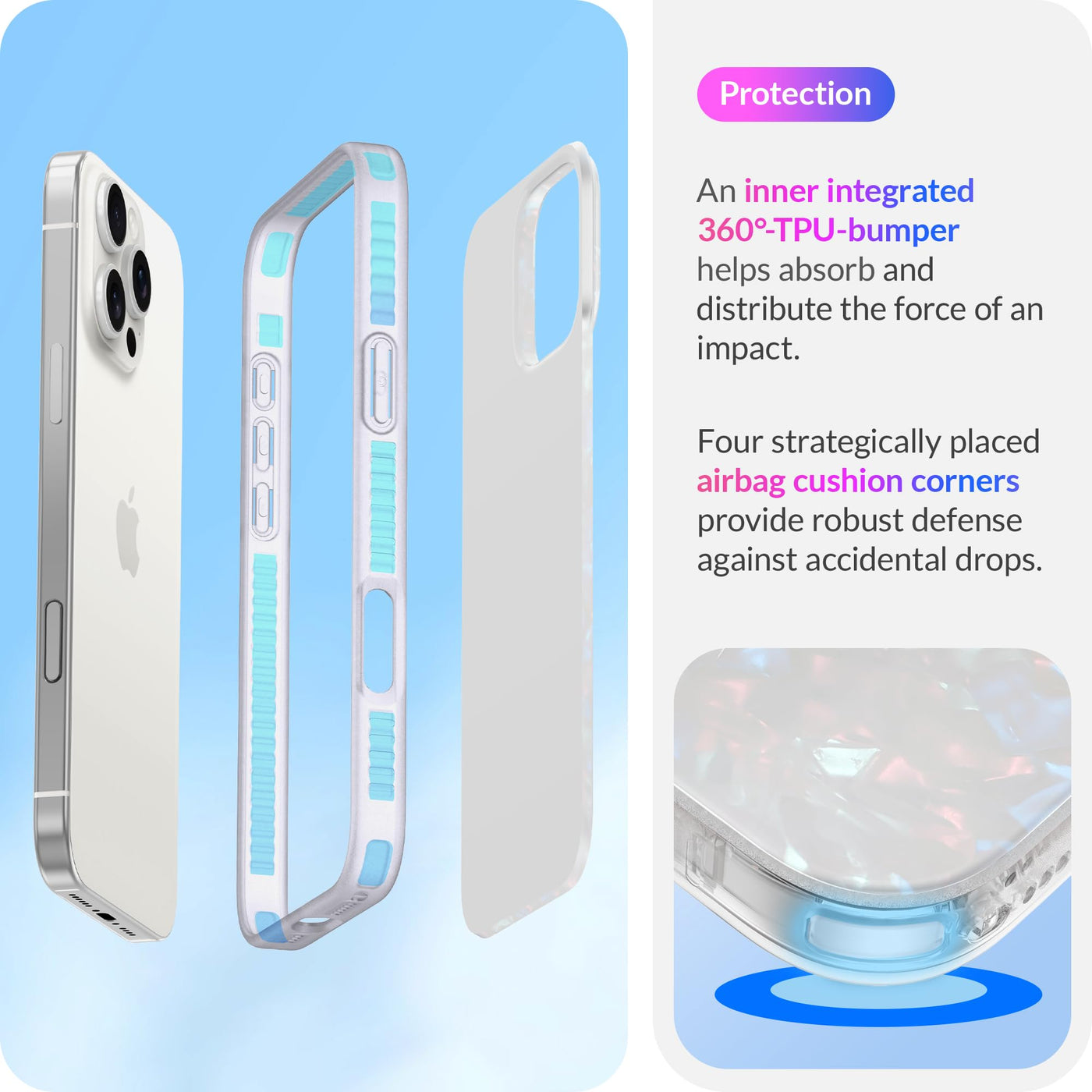 Q: How does the shock-absorbing bumper provide protection for my phone?A: The inner integrated shock-absorbing bumper is designed to protect your iPhone 16 Pro Max from drops of up to 10 feet, minimizing the risk of damage.