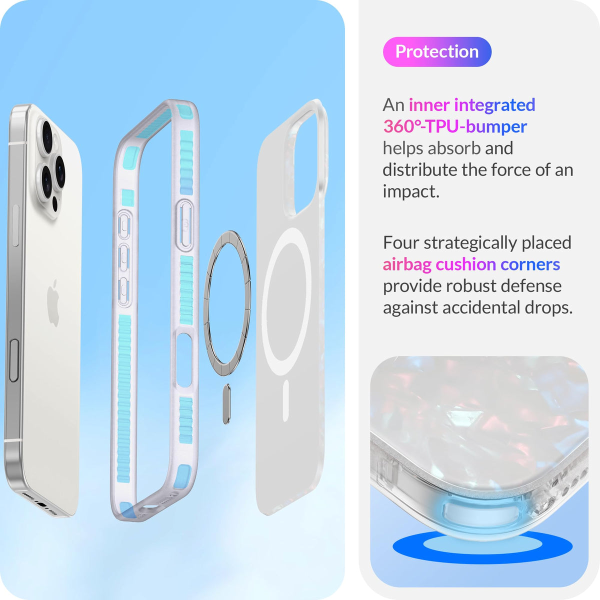 Q: How does the shock-absorbing bumper protect my phone?A: The inner integrated shock-absorbing bumper provides excellent protection, safeguarding your iPhone 16 Pro Max from drops of up to 10 feet, minimizing the risk of damage.
