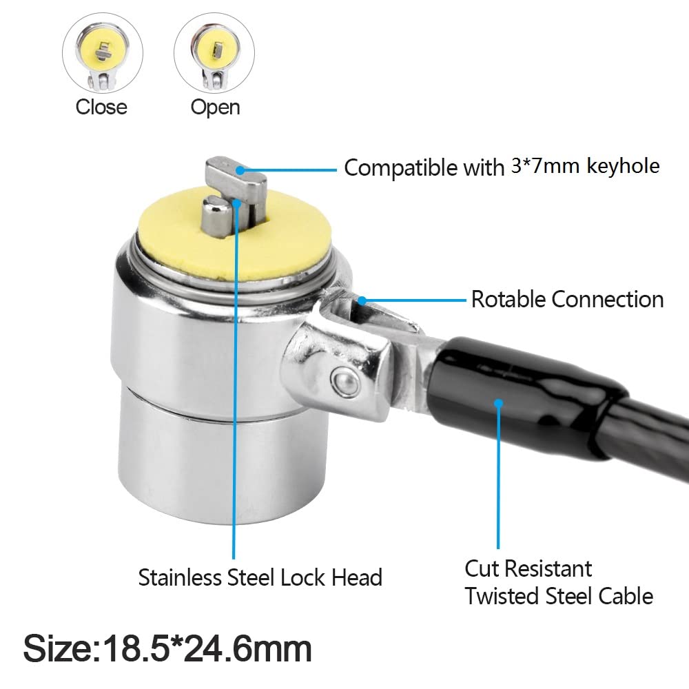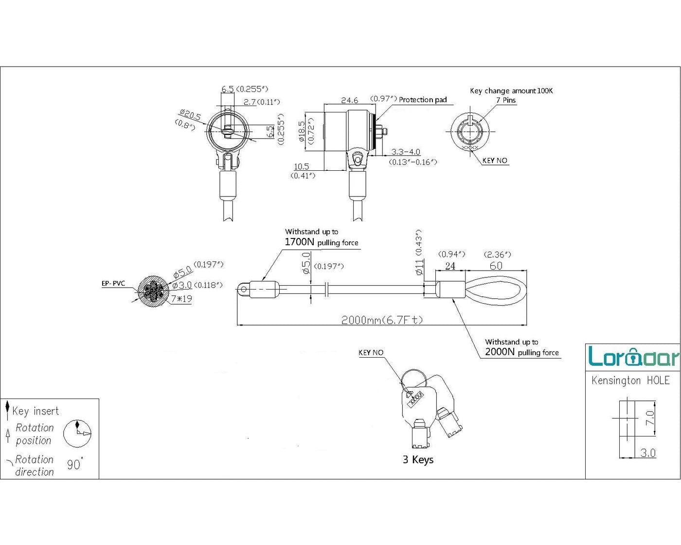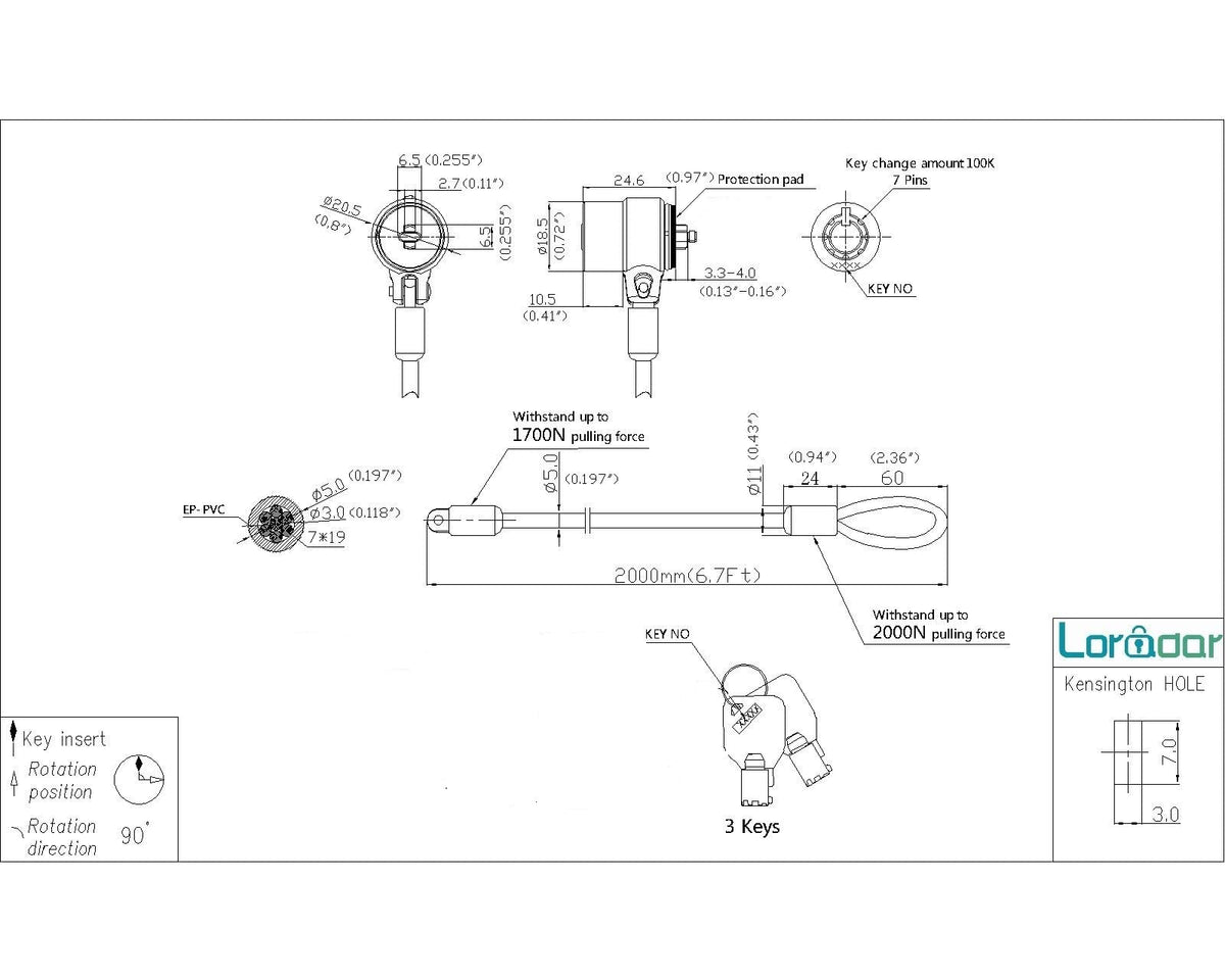 Q: What makes the LORADAR Laptop Security Cable Lock suitable for different devices?A: The LORADAR Laptop Security Cable Lock is designed with a 6.7-foot strong steel wire rope that can secure laptops, monitors, and desktop mainframes. It features a keyed different system allowing each lock to have a unique key, catering to various devices with 3*7mm security keyholes.