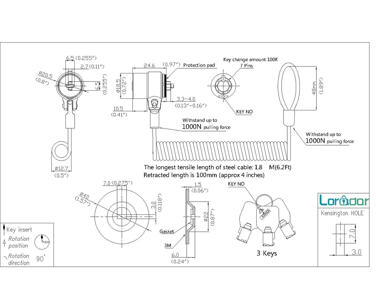 Loradar Security Hardware Cable Lock Kit,Retractable Cable Lock Portable Keyed Laptop Lock 3 Keys 6.2Ft For Monitors, Laptops, M