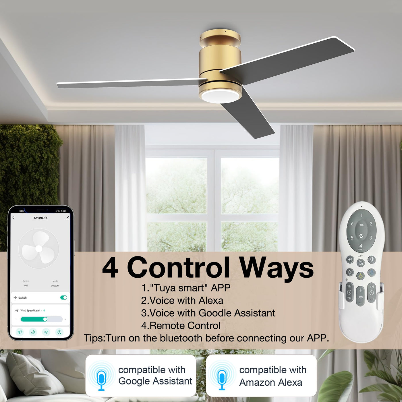 Transform Your Living Space With Our Cutting-Edge Smart Ceiling Fan With Lights And Remote Control. Engineered For Modern Convenience And Style, This 52-Inch Low Profile Flush Mount Ceiling Fan In Black And Wood Color Provides Both Functionality And Aesthetics, Suitable For Indoor Outdoor Places, Like Bedroom,Living Room,Kitchen,Patios And Porch. Stay In Total Control With Our Integrated Smart Technology. Compatible With Wifi, Alexa, Google Assistant And App, You Can Adjust Fan Speeds And Lighting Effortlessly With Simple Voice Commands Or Through The Intuitive Smartphone App. Plus, Even If Your Wifi Connection Is Down, You Can Still Enjoy Full Control Thanks To The Included Remote Control. Illuminate Your Home With Dimmable And Color-Changing Led Lighting. Installation Is Easy To Do. And The Low-Profile Design Makes It Ideal For Flush Mounting On Low Ceilings. Plus, With Its Whisper-Quiet Dc Motor, You Can Enjoy A Powerful Airflow Without The Distraction Of Noise, Perfect For Light Sleepers. Upgrade Your Home Today With The Ultimate Combination Of Comfort, Convenience, And Style. Add Our Smart Ceiling Fan With Lights To Your Cart Now And Experience The Future Of Home Living.