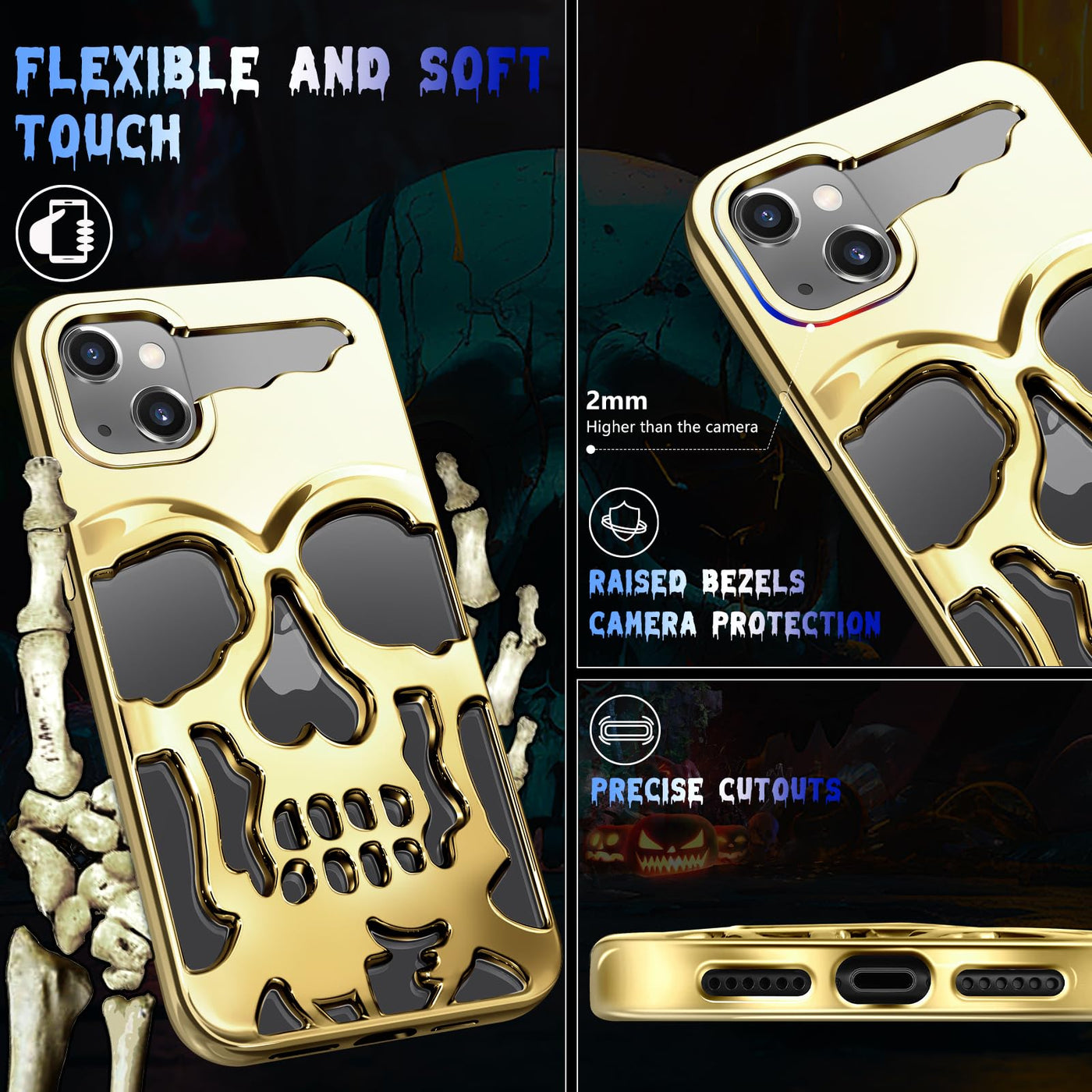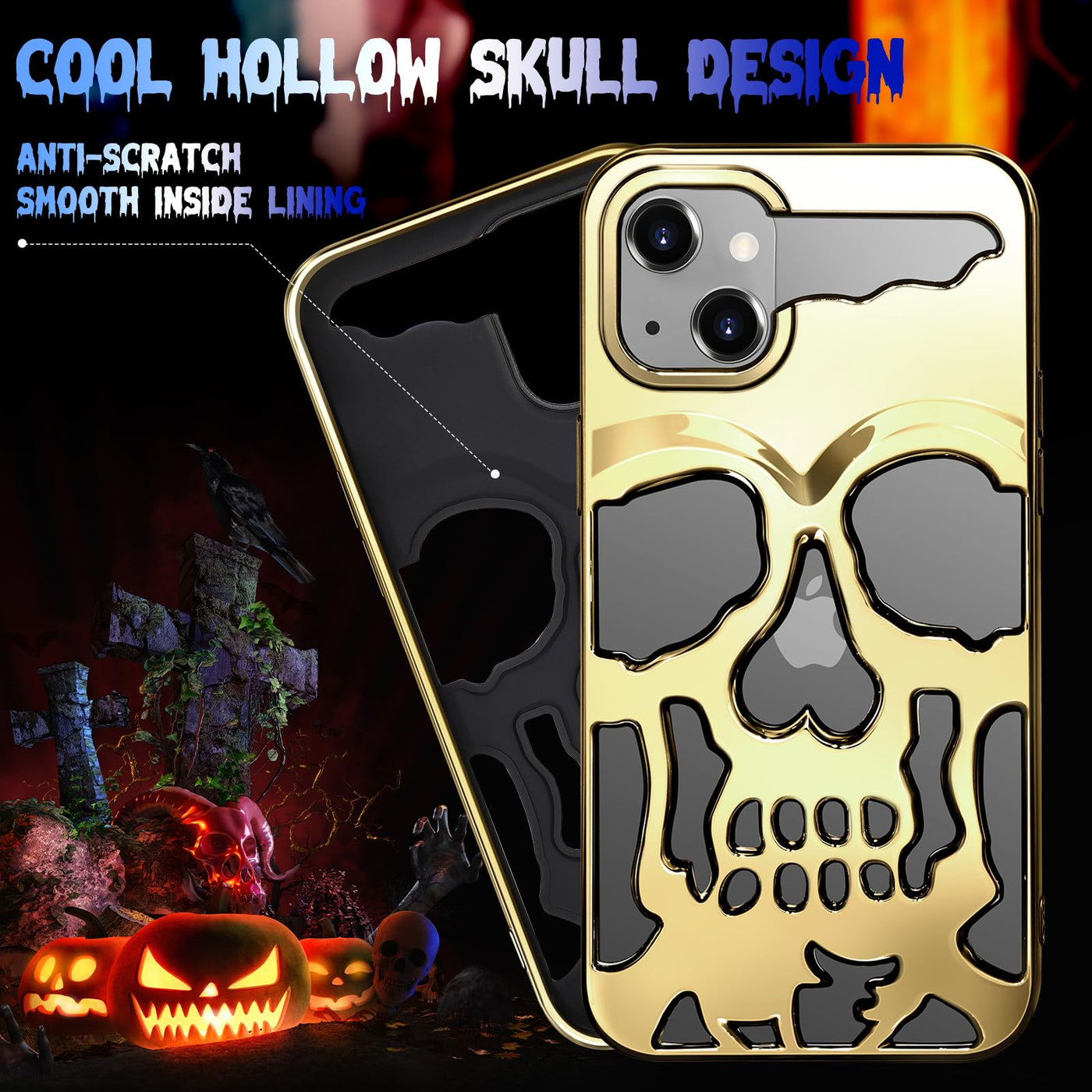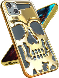 Lotadilo For Iphone 14 Plus Phone Case For Men Women, Cool Skull Skeleton Funny Gothic Hollow Halloween Phone Case For Iphone 14 Plus Cute Hollowed Plated Shockproof Cover For Boys Girls? Golden