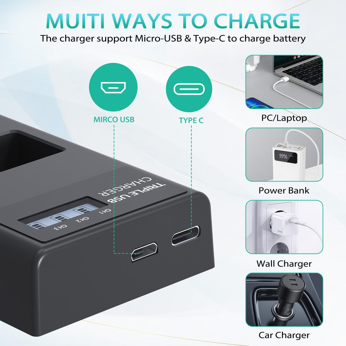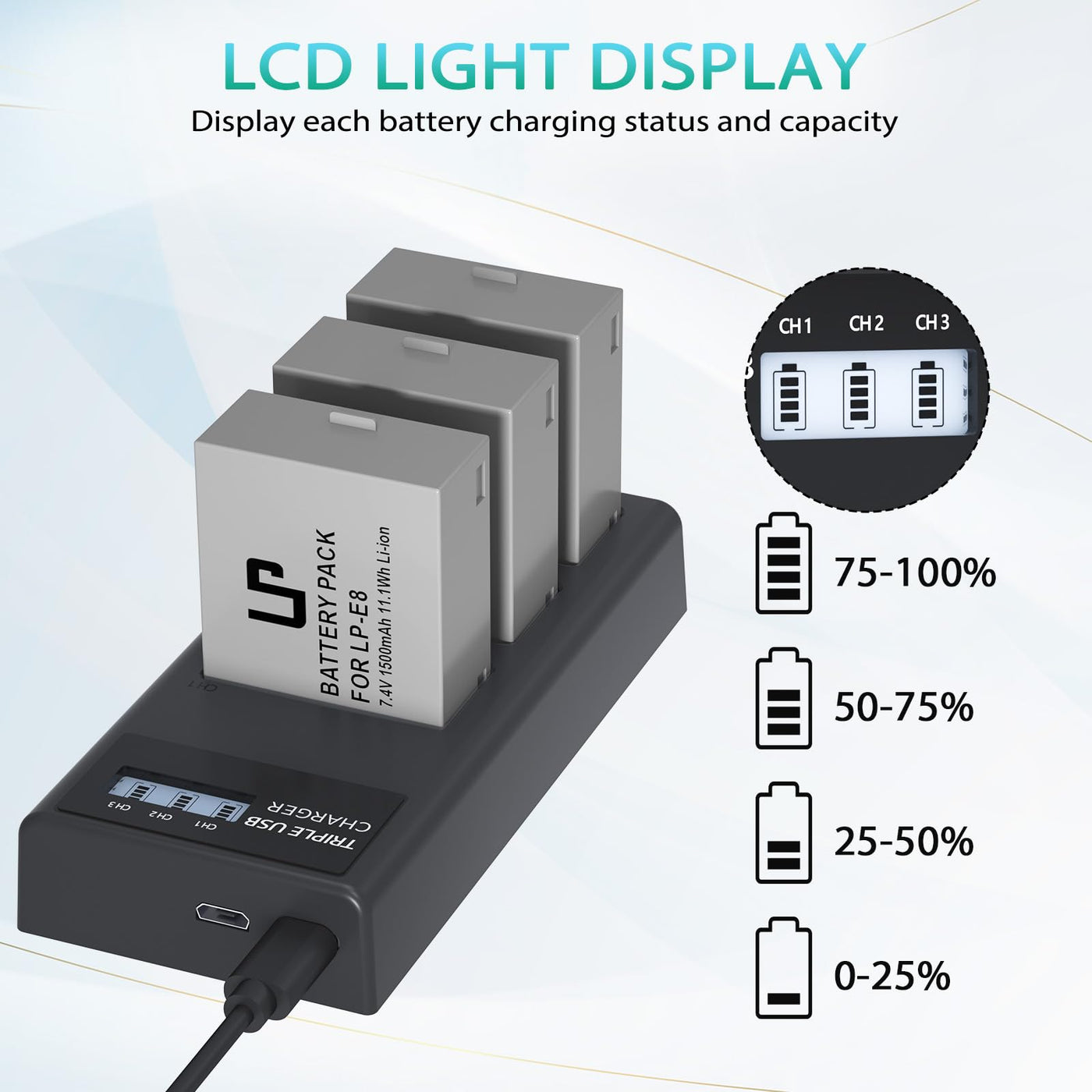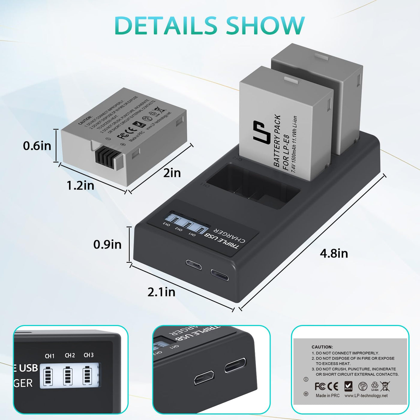 Q: Can I charge multiple batteries at once with this charger?A: Yes, the LP-E8 charger features a triple slot design that allows you to charge three LP-E8 batteries simultaneously using either a Micro-USB or Type-C input.