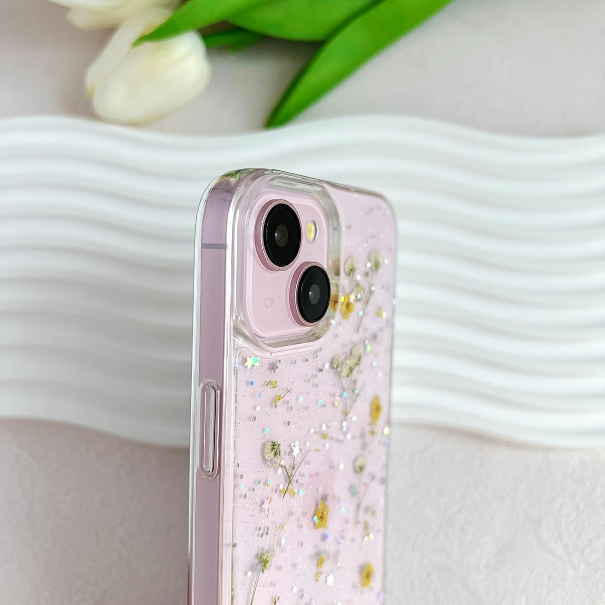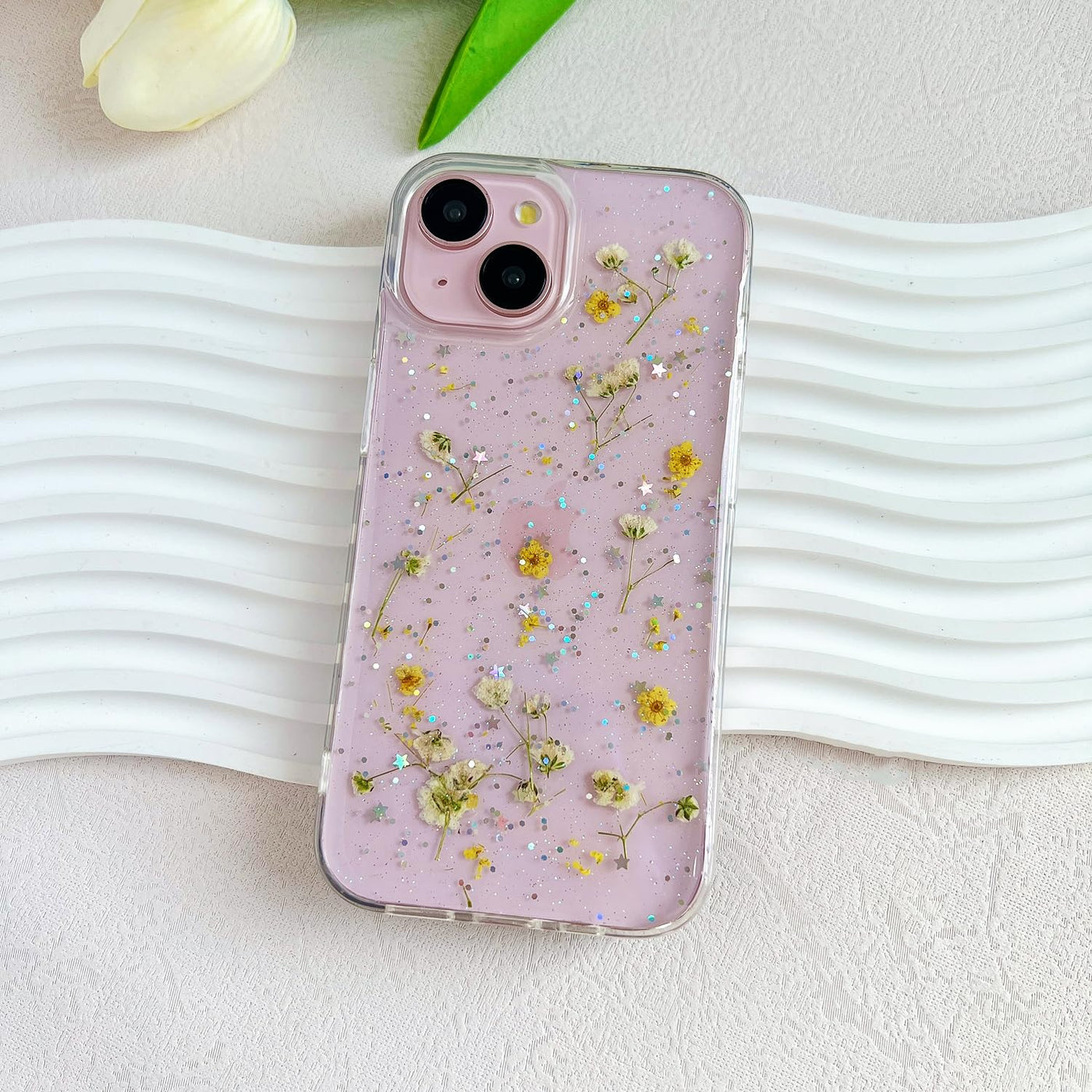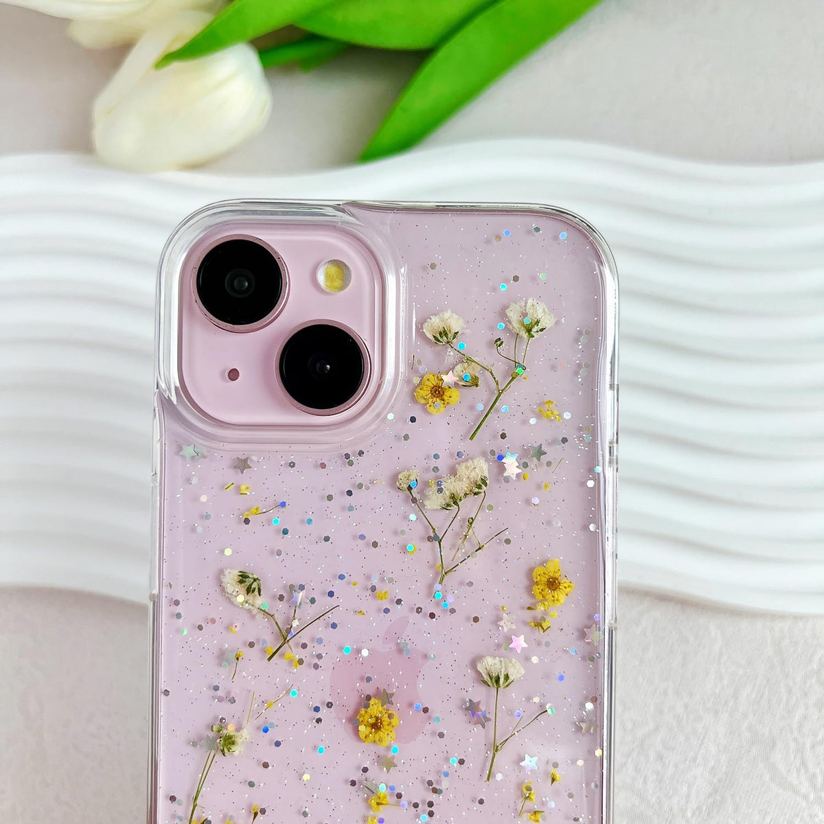 Lseeka For Iphone 13 Mini/Iphone 12 Mini Clear Case With Pressed Real Flowers Design,Glitter Cute Yellow Floral Slim Soft Tpu Pr