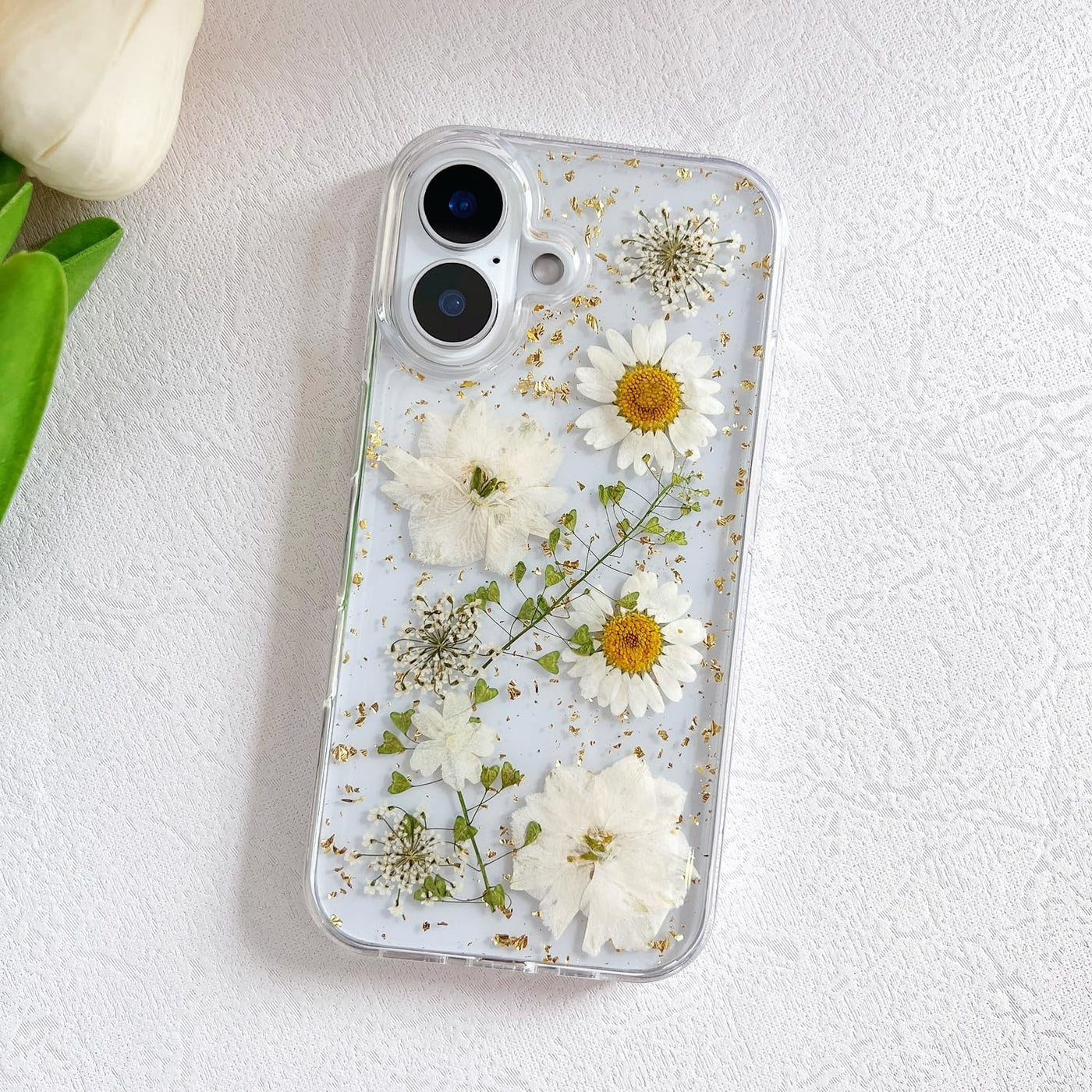 Lseeka For Iphone 16 Plus Clear Case With Pressed Real Flowers Design,Glitter Cute White Floral Pattern Slim Soft Tpu Protective