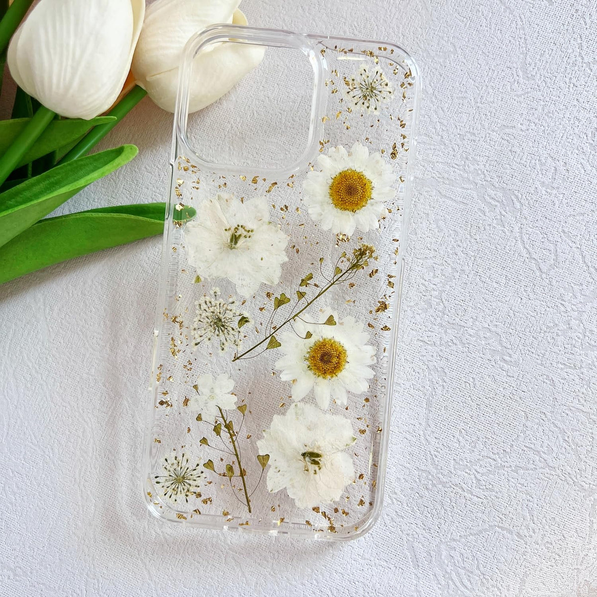 Q: How does the real flower design affect the phone case?A: The handmade real dried flower design makes each LSEEKA phone case unique and adds a fashionable touch, making your phone stand out while still providing protection.