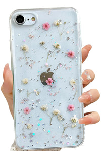 Lseeka For Iphone Se 2022/ Se 2020/8/7 Clear Case With Pressed Real Flowers Design,Glitter Cute Pink Floral Pattern Slim Soft Tp