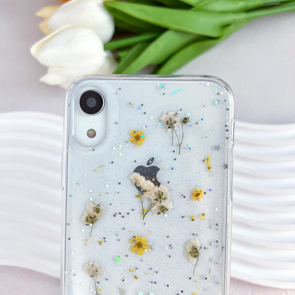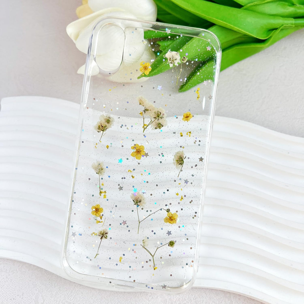 Lseeka For Iphone Xr Clear Case With Pressed Real Flowers Design,Glitter Cute Yellow Floral Pattern Slim Soft Tpu Protective Wom