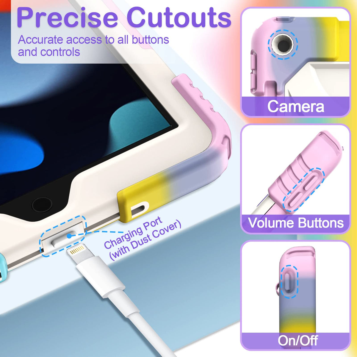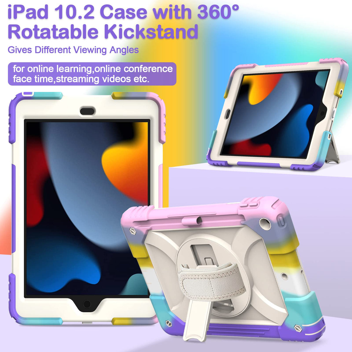Ltrop Case For Ipad 9Th/8Th/7Th Generation 2021/2020/2019, Ipad 10.2 Inch Case With Pencil Holder, Rotatable Kickstand & Hand/Shoulder Strap Cover Case For Women Kids Toddlers Girls, Beige/Multicolor