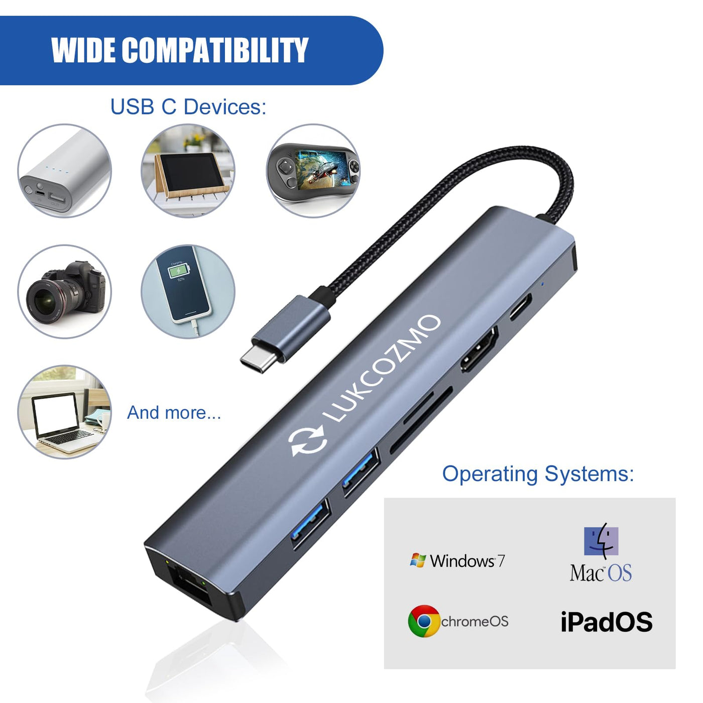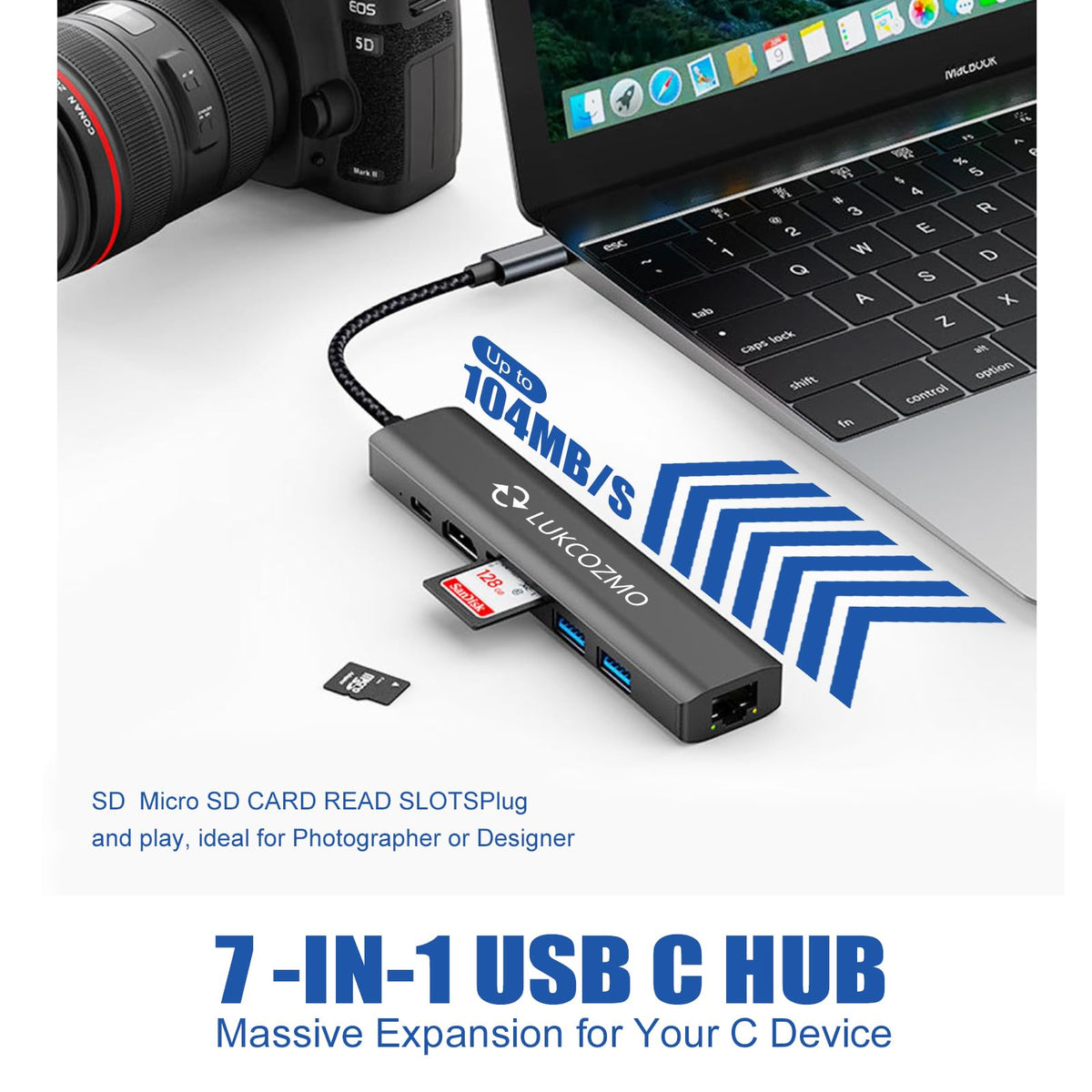 Lukcozmo Usb Hub 3.0, 7 In 1 Usb Hub With 1000M Ethernet, 4K Hdmi, 2 Usb3.0, 100W Pd, Sd/Tf Card Reader Docking Station Compatib