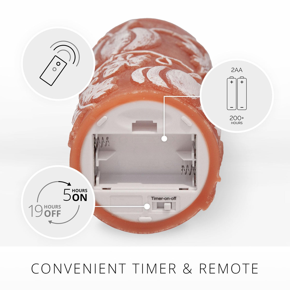 Fall In Love And Celebrate The Classic Shapes Of The Season. Exclusively Poured For Our Harvest 2023 Collection, This Orange Classic Flameless Candle Pillar With Recessed Top Has Been Beautifully Embellished With Imprints Of Ashy White Pumpkins With Leaves On Curly Vines. Product Features Size: 3.25'' X 6.5'' Color: Harvest Pumpkin Edge: Recessed Top Form: Pillar Scent: Unscented Finish: Embossed Material: Paraffin Wax Use: Indoor Led Technology: Real Flame-Effect On/Off/Timer Operation: Switch On Bottom Of Candle Timer: 5 Hours On/19 Hours Off Batteries Required: 2 Aa (Not Included) Battery Runtime: 200+ Hours Remote Ready: Yes Remote Included:No (Sold Separately)