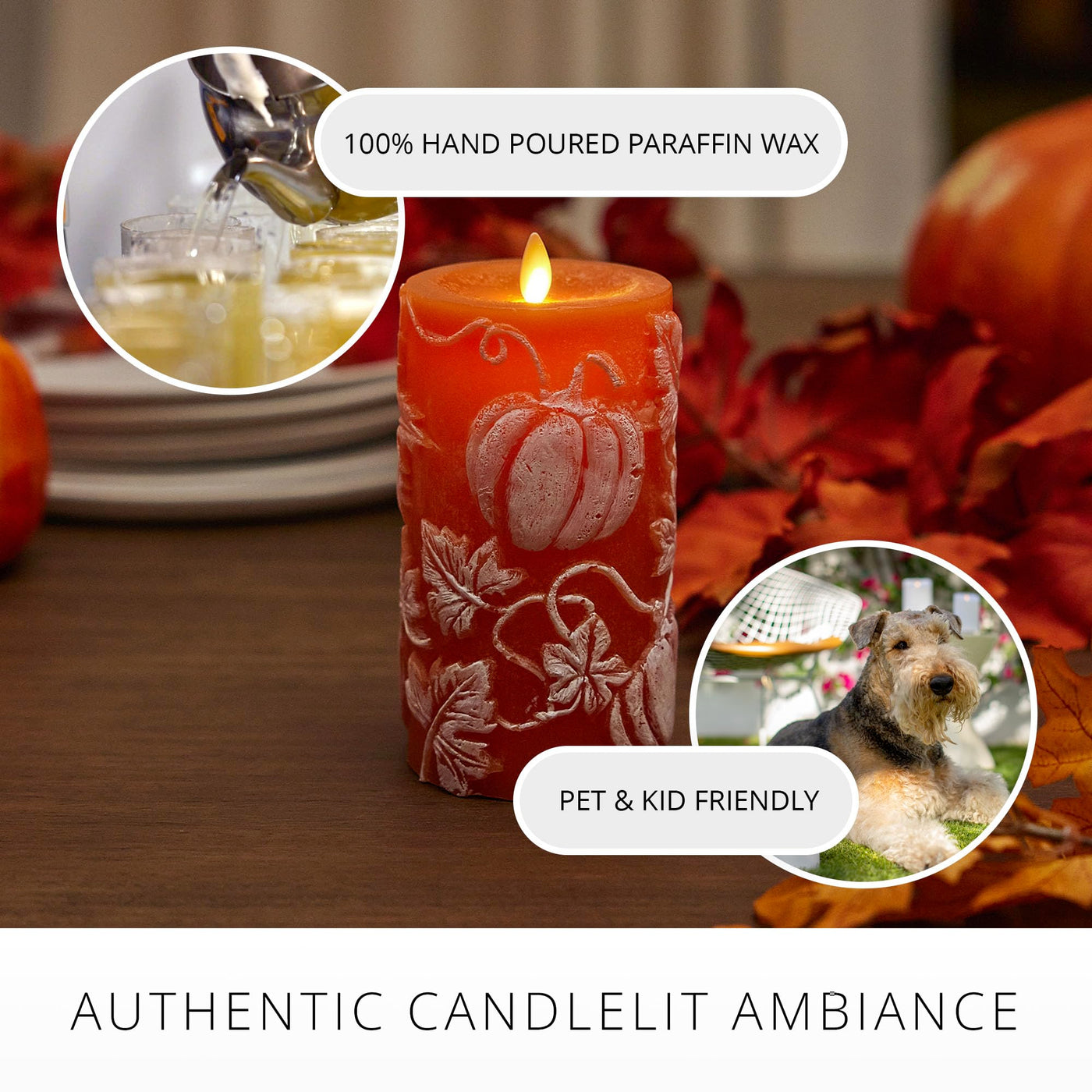 Luminara Embossed Leaves And Pumpkins Moving Flame Pillar Candle 3.25'' X 6.5'' With Recessed Edge Unscented Real Wax Led Batter