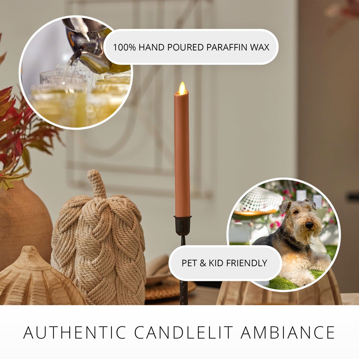 Our Adobe Single Taper Embodies The Charm And Color Of The Autumn Months. Complete With Patented Moving-Flame Technology, The Warm Flicker And Glow Of The Taper Accentuates Its Toasted Orange Color, While The Scallop Top And Smooth Wax Finish Make The Taper Feel And Look Just Like A Traditional Candle. Have Your Thanksgiving Tablescape Radiate With Warmth By Placing These Tapers In Our Bronze Wrought Iron Taper Holders For An Elegantly Rustic Aesthetic.