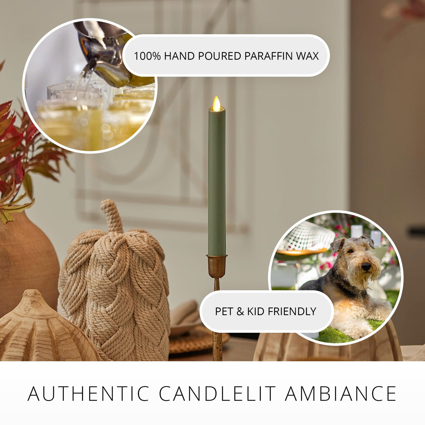 Our Loden Green Taper Has All The Elegance Of A Traditional Taper Candle Without Any Of The Mess Or Worry. Flickering With Authentic Moving-Flame Technology, This Flameless Candle Taper Has A Scallop Top And Smooth Wax Finish For Added Realism And Style. Place This Taper Alongside Your Other Fall D Cor For A Complementing Pop Of Color Or Pair With Our Brass Wrought Iron Taper Holder For Subtle Glamour Across Your Thanksgiving Tablescape.