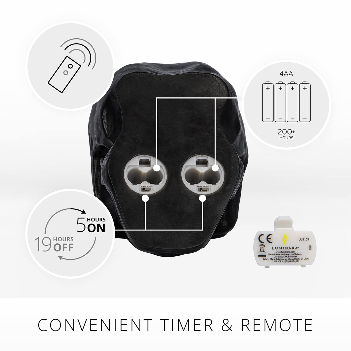 Q: Can I use the timer feature on the Luminara Skull Candle, and how does it work?A: Yes, the Luminara Skull Candle features a timer function that allows it to light up for 5 hours and then automatically turn off for 19 hours. This convenient feature helps to save battery life and ensures that the candle lights up at the same time each day.