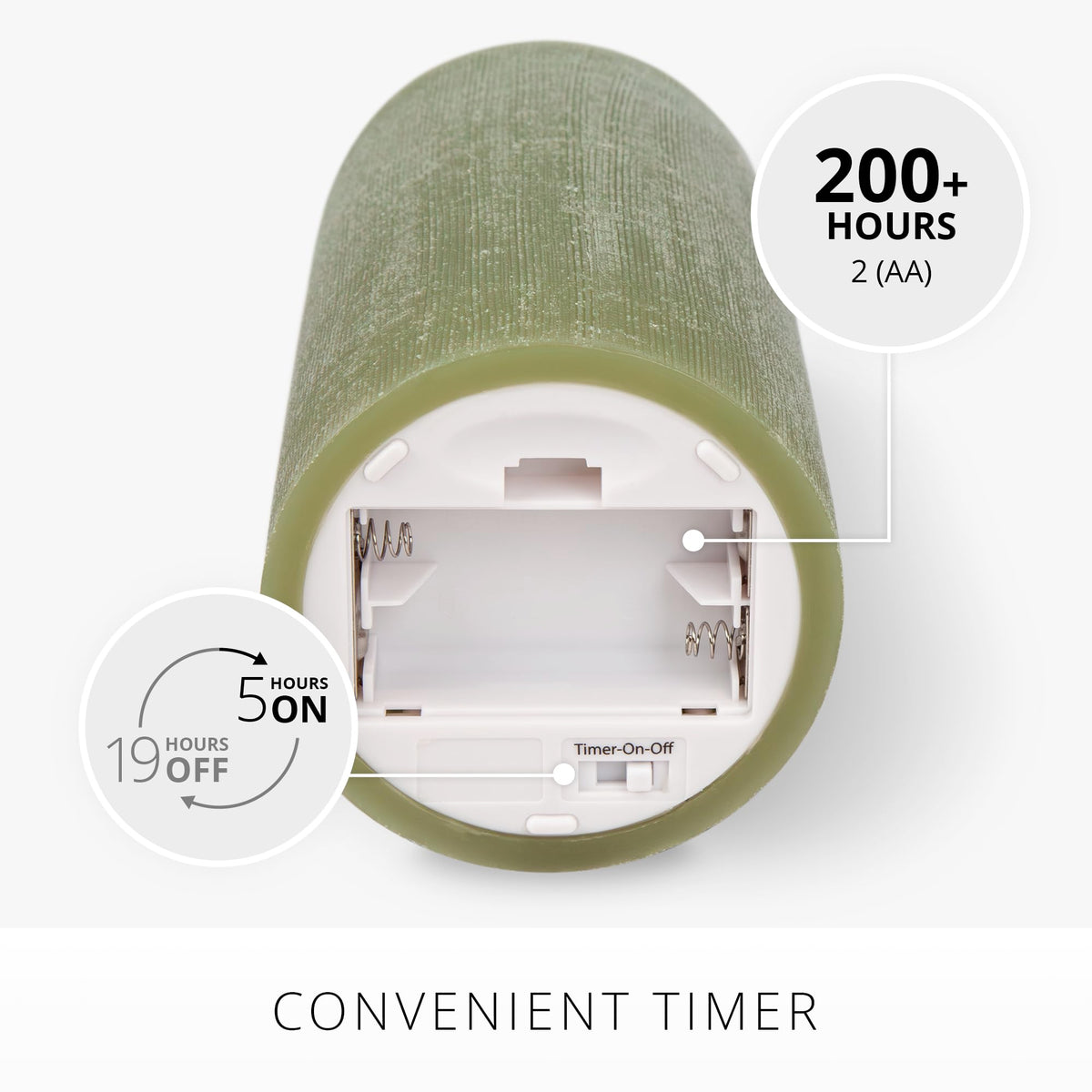 Q: How long do the batteries last in the Luminara candle?A: Each Luminara candle is powered by 2 AA batteries, which provide approximately 200 hours of safe and long-lasting illumination.