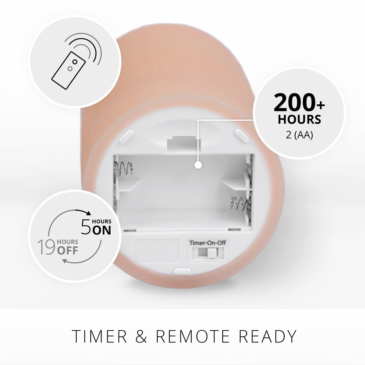 Celebrate The Colors Of The Spring Season With Our Chalky Linen Pillars Hand-Poured In A Mellow Peach Paraffin Wax Color. Featuring Luminaras Patented Real Moving-Flame Technology, These Pillars Provide Warm Ambient Lighting That Is Safe And Convenient, Especially Around Children And Pets. Festive And Elegant, These Pillars Offer A Refreshing And Crisp Variation To Smooth Classic Wax Pillars And Are A Perfect Easter Holiday Complement To Other Luminara Seasonal D Cor, Such As The Chalky Egg Flameless Candles. Product Features Size: 3'' X 6.5'' Color: Mellow Peach Edge: Flat Top Form: Pillar Scent: Unscented Finish: Chalky Linen Material: Paraffin Wax Use: Indoor Led Technology: Real Flame-Effect On/Off/Timer Operation: Switch On Bottom Of Candle Timer: 5 Hours On/19 Hours Off Remote Ready: Yes Remote Included: No Batteries Required: 2 Aa (Not Included) Battery Runtime: 200+ Hours