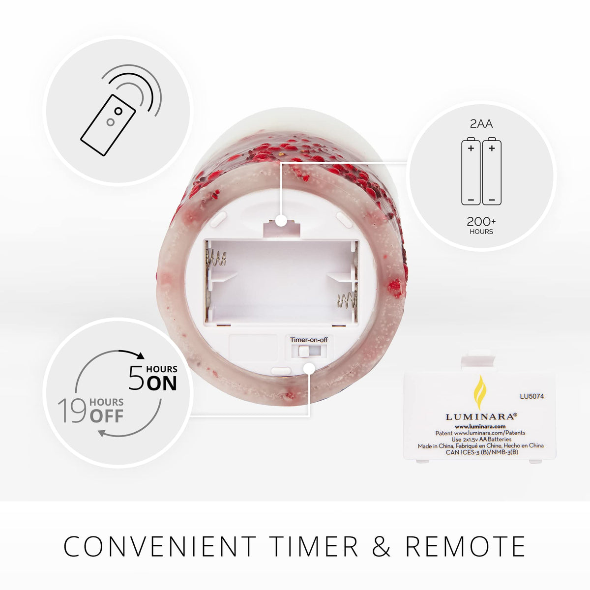 Q: What type of batteries does this candle require?A: The Luminara Embedded Flameless LED Candle requires two C batteries, which are not included with the purchase.