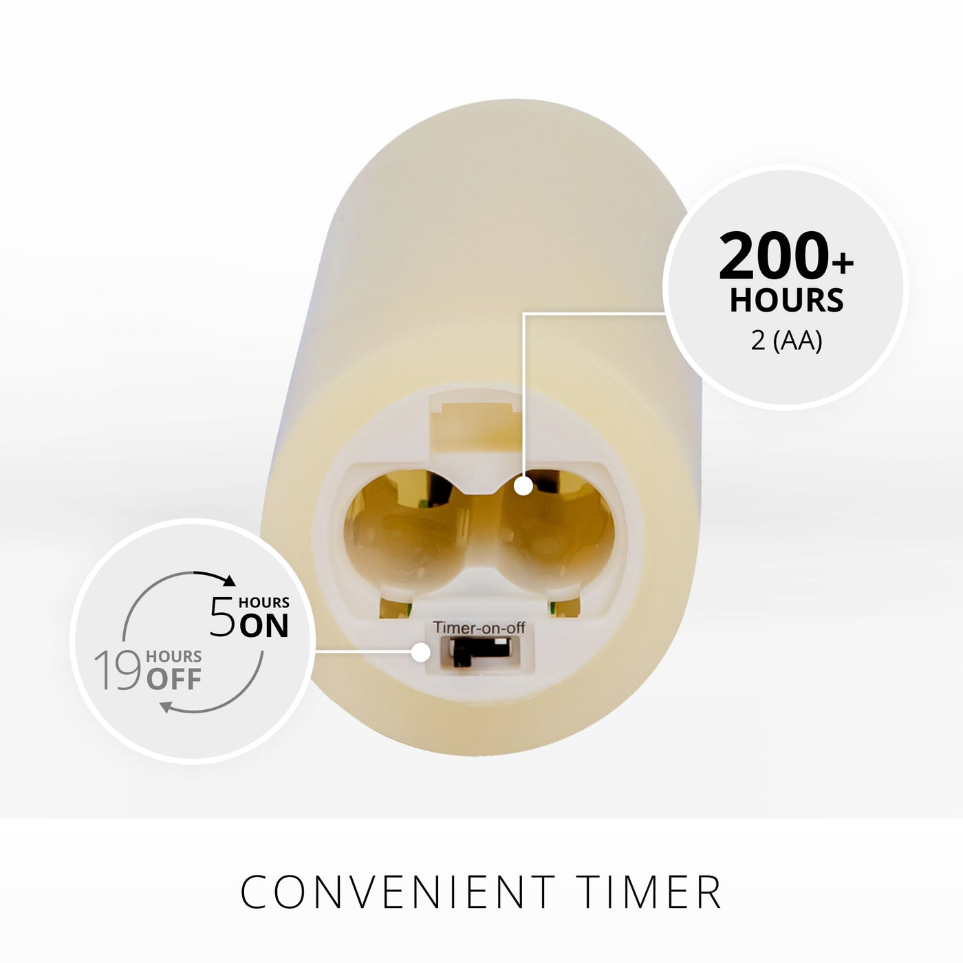 Q: What type of batteries does the Luminara Classic Slim Candle require, and how long do they last?A: The Luminara Classic Slim Flameless Candle requires 2 AA batteries (not included). With proper usage, including the timer function, the candles can provide up to 200 hours of runtime before the batteries need to be replaced.