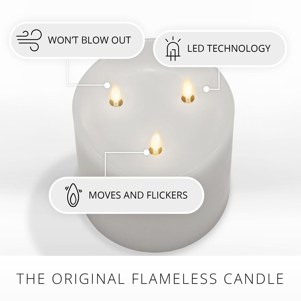 With Three Moving-Flame Wicks, The White Tri-Flame Pillar Is A Contemporary Upgrade To Traditional Pillars. The Realistic Flame-Effect Technology Looks Stunning Across The Melted Edge Top And Its Smooth Wax Finish Provides An Elegant Touch, Whether On Its Own Or When Arranged Together In Both Of The Available Size Options. Product Features Size: 5.8'' Diameter; In 9.7'' Color: White Edge: Melted Top Form: Grand Pillar Scent: Unscented Finish: Smooth Material: Paraffin Wax Use: Indoor Led Technology: Real Flame-Effect On/Off/Timer Operation: Switch On Bottom Of Candle Timer: 5 Hours On/19 Hours Off Remote Ready: Yes Remote Included: No, Sold Separately Batteries Required: 2 D (Not Included) Battery Runtime: 250 Hours