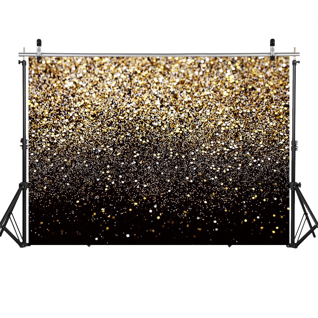 Q: What size is the LYCGS Black and Gold Backdrop?A: The LYCGS Black and Gold Backdrop measures 8 feet wide by 6 feet high (240cm x 180cm), making it suitable for various events and photography needs.