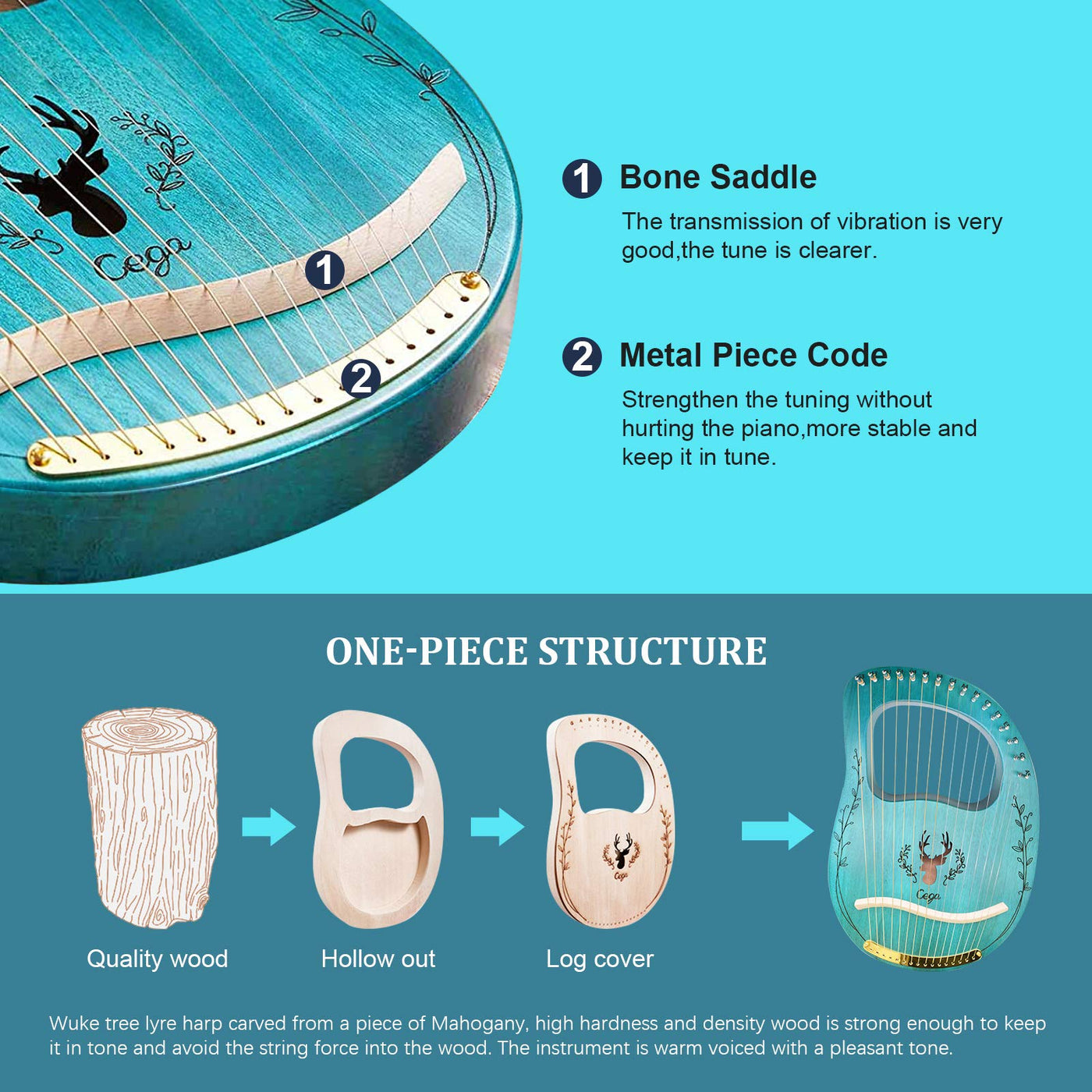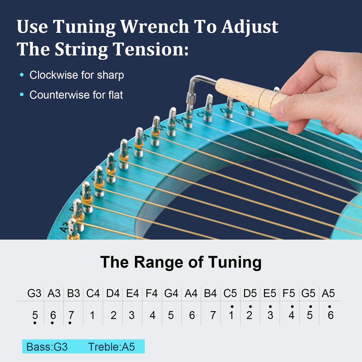 Lyre Harp 16 Strings: Solid Mahogany Wooden Body Metal Strings Musical Instrument - Accessory With Tuning Wrench And Durable Gig Bag