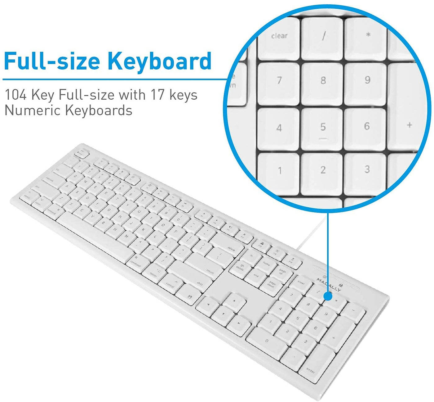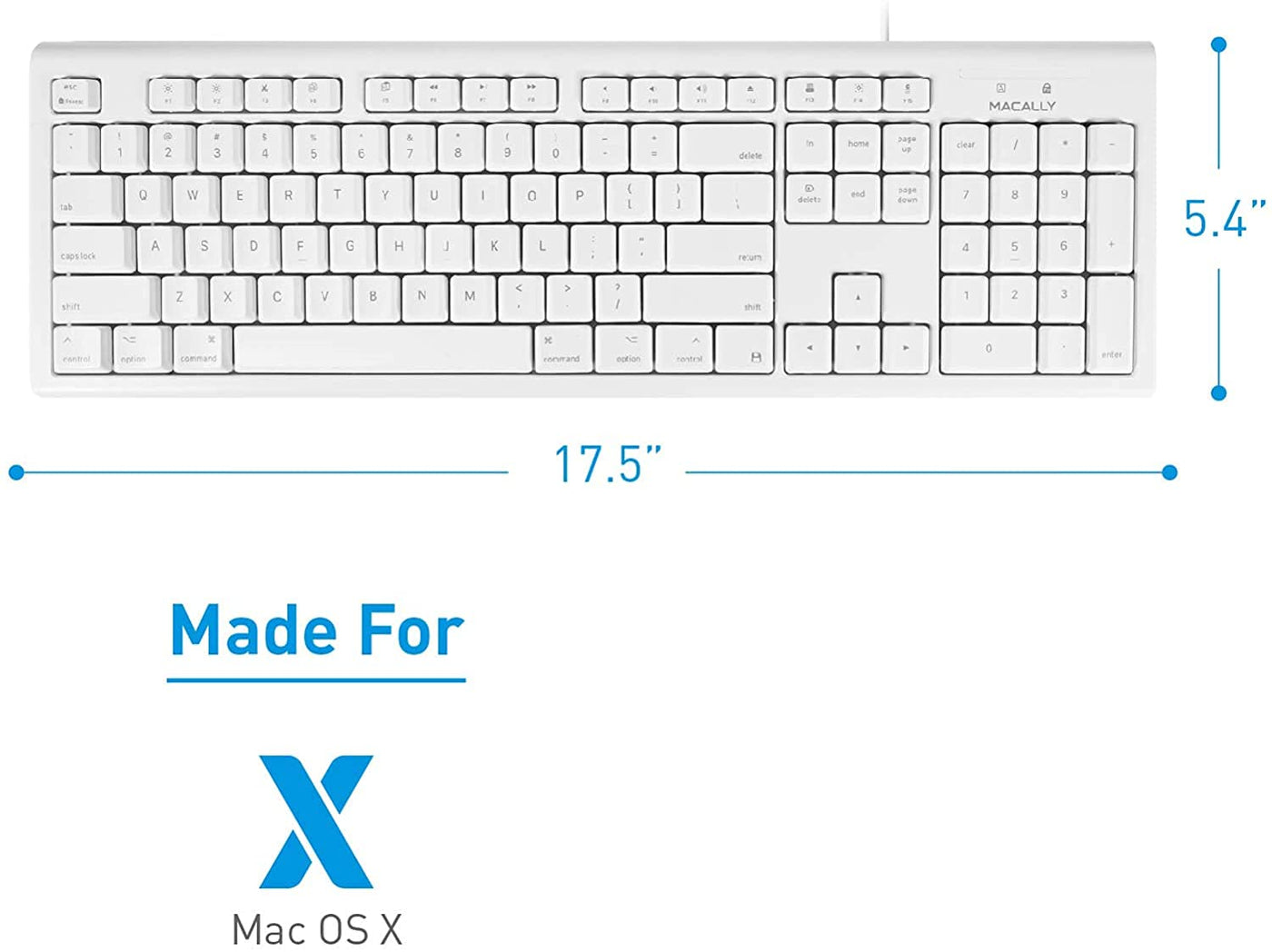 Macally Qkey & A Full Size Keyboard Specially Designed For Macthe Macally Qkey Is A Usb Keyboard With A Standard Layout And 104 Full Size, Yet Thin, Keys For A Comfortable And Efficient Typing Experience. The Additional Shortcut Keys And Numeric Keyboard Further Increase Efficiency And Productivity.Elegantly Engineered To Mix Ergonomics & Style: At Only 0.79Mm In Height, The Thin, Compact Design Makes The Qkey More Versatile Than Ever For Various Occasions And Usages. Not To Mention, The Sleek And Stylish Frame/Body That Will Match Your Apple And Mac Devices Flawlessly.Amazingly Comfortable Keycaps And Integrated Kickstand For Superior Typing Experiences: The Slightly Thin And Curved Keycaps Provide Immense Comfort And Enhance Your Overall Typing Productivity. Choose Between Typing With An Angled Keyboard Or Flat Keyboard. Easy To Use (Plug & Play) And Compatible With Mac Os X 10.6 Or Higher The Macally Qkey Is Very Easy To Use, And No Software Is Required! Simply Plug The Cable Into The Usb Port Of Your Computer, And You Are Ready To Go! Unlike Wireless Keyboards, This Keyboard Doesnt Need Charging Nor Syncing.Specs: * 104 Full-Size Keyboard * 16 Convenient Shortcuts For Mac * Integrated 10 Number Keypad * Dimensions: 5.4 X 17.5 X 0.78 * Weight: 1 (Lb) * Cable Length: 5 Ft (150Mm)Worry-Free Warranty At Macally, We Believe In Our Products. Thats Why We Back All Of Our Product With A One-Year Warranty, 30 Days Hassle Free Return And Provide Friendly, Easy-To-Reach Customer Support.