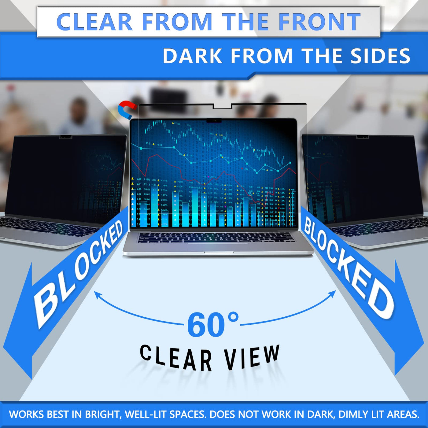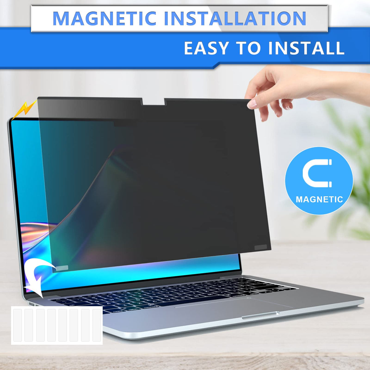 Compatible Model: Only Designed For Macbook Pro14 Inch Privacy Screen 2021-2023 Release(Compatible Model: M3 Pro/M3 Max/M2 Pro/M2 Max/M1 Pro/M1 Max With A2918/A2992/A2442/A2780 Touch Id & Retina Display) Note: Different Models Correspond To Different Cases, Please Check The Model Number On The Bottom Of Your Laptop Carefully. Macbook Pro 14 Inch Privacy Screen Protector Only Compatible For 2021 New Macbook Pro 14 Inch With M3 Pro/M3 Max/M2 Pro/M2 Max/M1 Pro/M1 Max Chip Macbook Pro 14 Privacy Screen Protector Magnetic Privacy Film: Simply Place The Privacy Screen Along The Top Of Your Macbook And Let The Magnets Attach Along The Top. No Need For Tricky Placement, Messy Tape, Or Damaging Adhesive. Easily Remove And Reattach When You Need It. Please Note, When The Privacy Screen Is Attached, Your Laptop Will Not Close Completely, But The Sleep Mode Is Still Supported. Privacy Screen Filters Compatible With Macbook Pro 14 Inch 2021: The Computer Privacy Screen Filter Is Perfect For Office, Public, And High Traffic Areas. It Limits Viewing Angle To +/- 30 Degrees, Data Is Visible Only To Persons Directly In Front Of The Monitor While Prying Eyes Beside You See Only Nothing. Black Screen For Others: Over 15%~23% More Clarity Than Other Brands Monitors. When Viewing From 30- 60, The Computer Privacy Filter Makes The Screen Appear Dark And See Nothing. Anti-Blue Light & Anti-Glare Eye Protection: The Macbook Pro 14 Inch Scree Protector Privacy Monitor Not Only Protects Your Privacy But Also Protects Your Eyes By Filtering Out Glare That Can Adversely Affect Your Eyes. Our Privacy Screen Also Helps Protect Your Screen From Dust And Scratches. You Will Get: Macbook Pro 14 Privacy Screen 1 Cleaning Kit 1