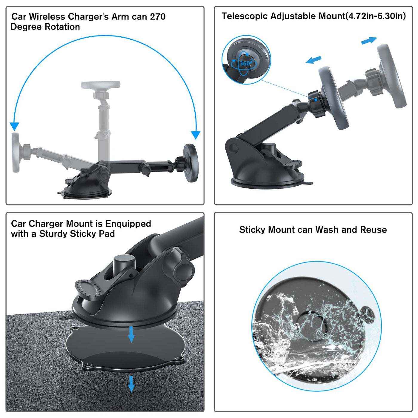 Product Description: Mag-Safe Car Vent Mount Is Compatible With Iphone 16/15/14/13/12 Series,Official Mag Safe Case,Android Series &Nbsp;The Aluminum Shell Material For Iphone Mag Safe Car Mount, Which Is Beneficial To Heat Dissipation, Increasing The Service Life Of Mag Safe Car Charger&Nbsp; Magnetic Phone Holder For Car Charger Have Fast Charging Function, It Has Intelligent Protection Chip To Prevent Mobile Phone From Heating Up And Stopping To Charge. Car Magsafe Mount Has 1300G Powerful Magnetic Force,It Ensure That Your Mobile Phone Never Drop Off Even In Bumpy Road.&Nbsp; Magsafe Car Holder Can Install In The Car Dashboard And Air Vent. Note: You Can Have More Installation Choices: Such As Windshield Or Desktop Or Other Smooth Places. Wireless Phone Charger Have 2 In 1 Installation Methods :Such As Installing In The Car Dashboard,And Air Vent Slot. So Dont Worry Fast Charging Car Charger Phone Holder Mount Not Suit For Your Car. Note :One Surprise Design: Wireless Car Charger Also Used As Car Phone Holder. Magnetic Car Charging Mount With A New Upgrade Long Arm. Which Has Retractable Function And It Can Extend From 4.72-6.3Inches. There Are Two Buttons: One Can Adjust The Telescopic Rod Length , Another One Can Adjust The Telescopic Rod Angle(270 Rotation).The Ball Joint Can 360 Degree Rotation, Adjust Mobile Phone To The Best View Angle. Package: 1 X Wireless Car Charger 1 X Suction Cup&Nbsp; 1 X Sticky Pad 1 X Air Vent Clip 1 X&Nbsp; Charging Cable 1 X Metal Plate 1 X Manual Book