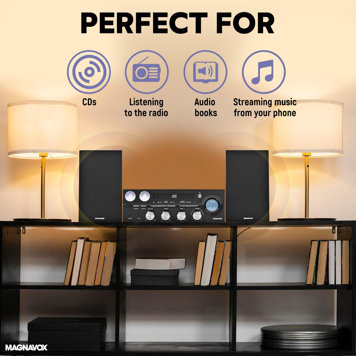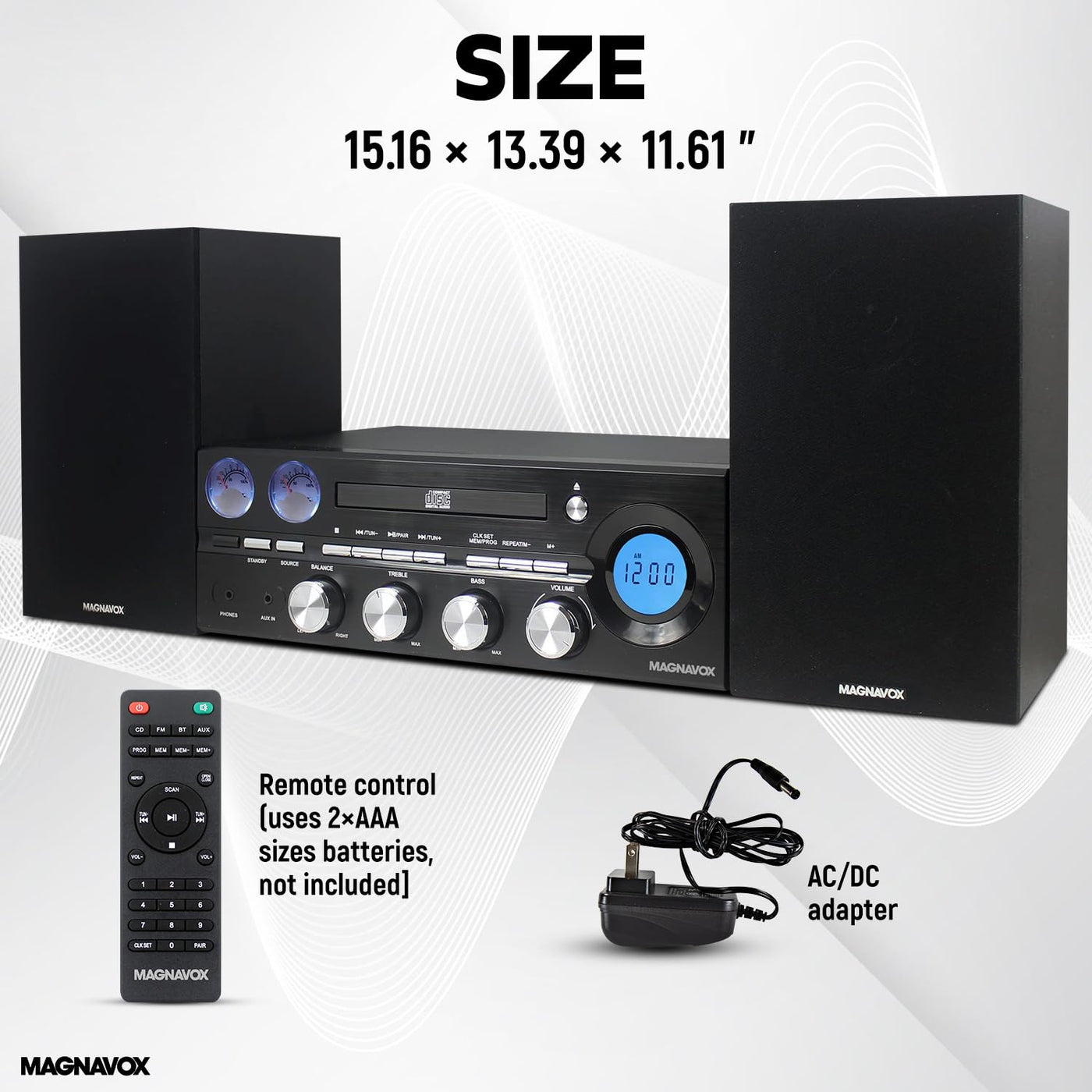 Key Features: Tray Loading Cd Player, Total 50W Rms Output (2 X 25W), Programmable Cd Player, Digital Pll Fm Stereo Radio, 20 Preset Stations, Lcd Display With White Backlight, Rotary Controls, Connects To Any Audio Device Via 3.5Mm Aux In Port, 3.5Mm Headphone Jack, Bluetooth 5.0 And Ac Operation. Accessories Include: Remote Control (Uses 2 X Aaa Sizes Batteries, Not Included) And Ac/Dc Adapter. | Bluetooth: Magnavox Speakers Keep The Party Going Come Rain Or Shine. Experience A Premium Audio Experience In Your Office, Bedroom, Living Area, Or Kitchen. Connect To Your Smartphone, Tablet Or Other Audio Device Via Bluetooth Or The Aux Port To Listen To Your Music, Videos Or Games Wherever You Go! This Bluetooth Speaker System Provides Premium Audio You Are Sure To Appreciate! | Quality: After All These Years We Continue To Manufacture Products To Meet Our Customers' Needs And Wants. We Strive To Make Quality Products At The Lowest Prices. Built Using High-Quality Materials For A Long-Lasting Finish And Maximum Usability. | Commitment: Magnavox Is Committed To Maintaining A Clean Environment. All Televisions And Computer Devices Recovered For Recycling Will Be Processed In A Manner That Complies With All Applicable Federal, State, And County Laws And Requirements. | Performance: The Magnavox Brand Is Ubiquitous Among Popular Products Found In Households Around The World. Today