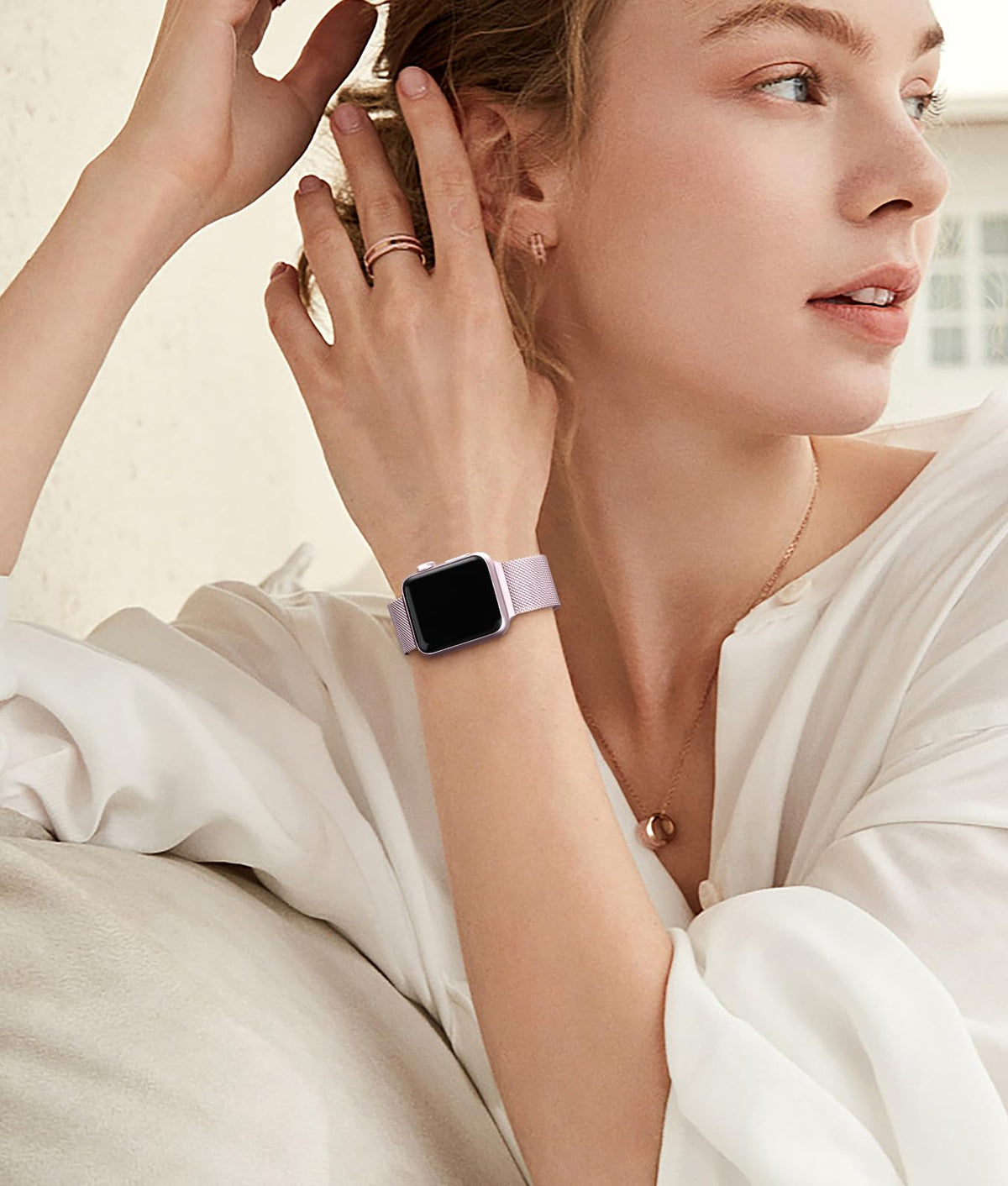 Q: What makes the Rabini stainless steel band different from other Apple Watch bands?A: The Rabini stainless steel band stands out due to its premium material, advanced mesh weave construction, and a strong magnetic closure. It is designed to be flexible, breathable, and stylish, making it suitable for both casual and formal occasions. Additionally, it minimizes skin irritation, being nickel-free.