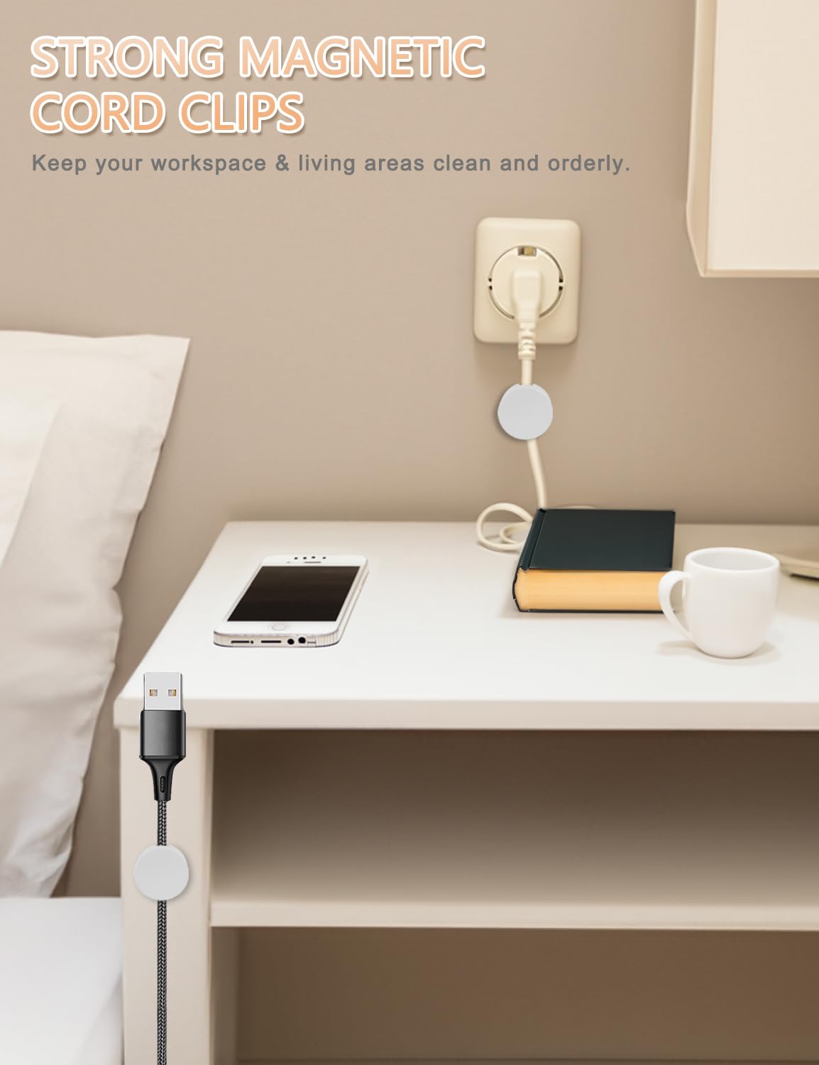 Q: Can I use the magnetic cable clips on any surface?A: The magnetic cable clips work best on smooth, flat surfaces such as desks, walls, and car dashboards. They adhere securely to metal surfaces and can be easily removed without leaving sticky residue. However, they may not stick well to textured or uneven surfaces.