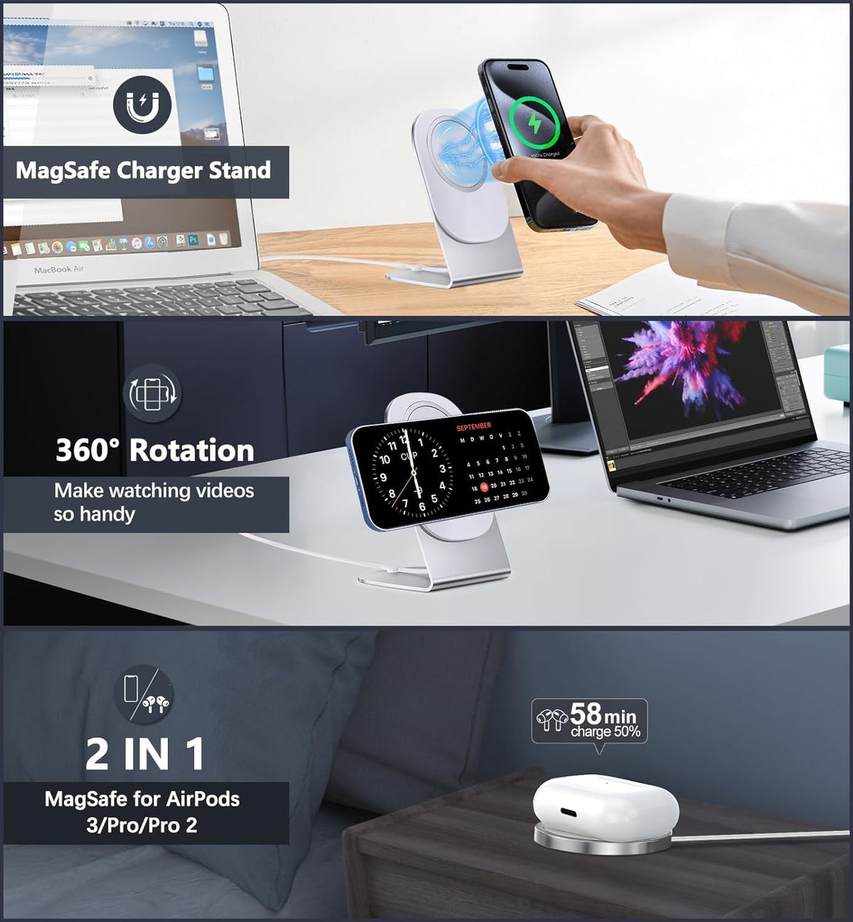Magnetic Wireless Charger For Iphone 15/14/13/12 Serious Mag-Safe Charger With Dual Charging Ports And Cable Compatible Devices: Iphone 15, Iphone 15Pro, Iphone 15 Pro Max, Iphone 15 Plusiphone 14, Iphone 14 Pro, Iphone 14 Pro Max, Iphone 14 Plus Iphone 13, Iphone 13 Pro, Iphone 13 Pro Max, Iphone 13 Mini Iphone 12, Iphone 12 Pro, Iphone 12 Pro Max, Iphone 12 Mini Iphone Cases With Mag-Safe For Iphone 11 Series/Xs/Xr/X/8/8 Plus Airpods 3/2/Pro Product Detailed Description Magnetic Wireless Charging Stand + Pad: Strong Magnet Aligns Your Iphone Automatically, Holds Your Phone Up Strongly In Place And Prevent Falling Off The Stand. Original Mag Safe Charger Compatible: Our Mag Charging Pad Is Completely Same Size As The Apple Mag-Safe Charger, It Can Be Easily Take Off And Replaced With The Original Mag Charger. Rapid And Safe Charing: Provides Fast Charging Up To 7.5W When Using The Wireless Charing And Protects Your Iphone From Burning Hot, Overcharging, Over-Current, Over-Voltage And Short-Circuiting. Stable And Scratch-Resistant: Wireless Charging Station Is Made Of Durable Aluminum Alloy And Flexible Rubber Material, Gives Your Phone A Firm Support And Protect It From Scratches. Suitable Angle And Position: You Can See The Screen Without Having To Pickup Your Phone. This Wireless Charging Stand And Pad Combination Holds Your Phone Vertically Or Horizontally For Your Different Purpose. Material: Aluminum Alloy And Rubber Package Includes: 1* Magnetic Wireless Charger, 1* Stand For Magnetic Wireless Charger 1* User Manual1* Dual Charging Ports And Cable*1