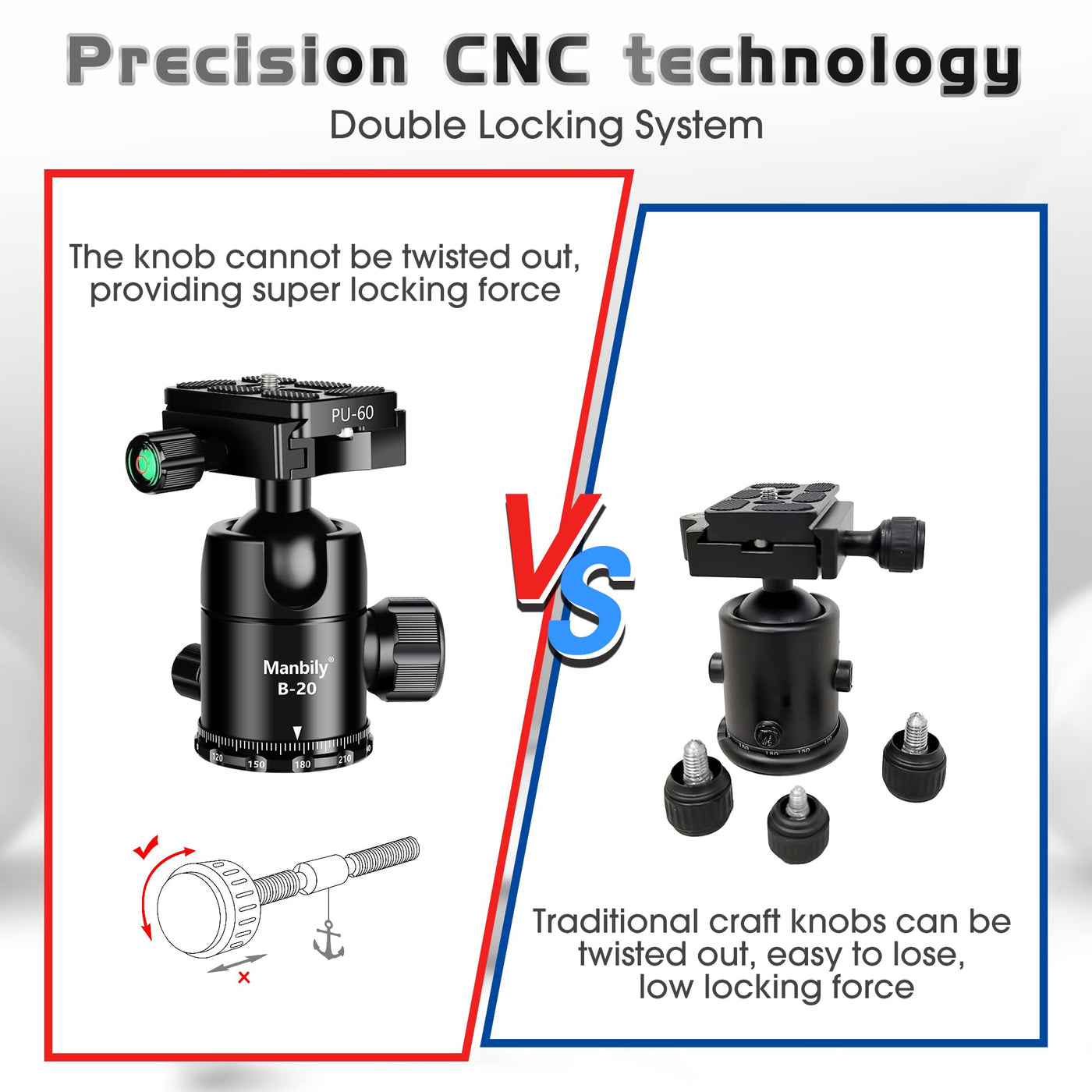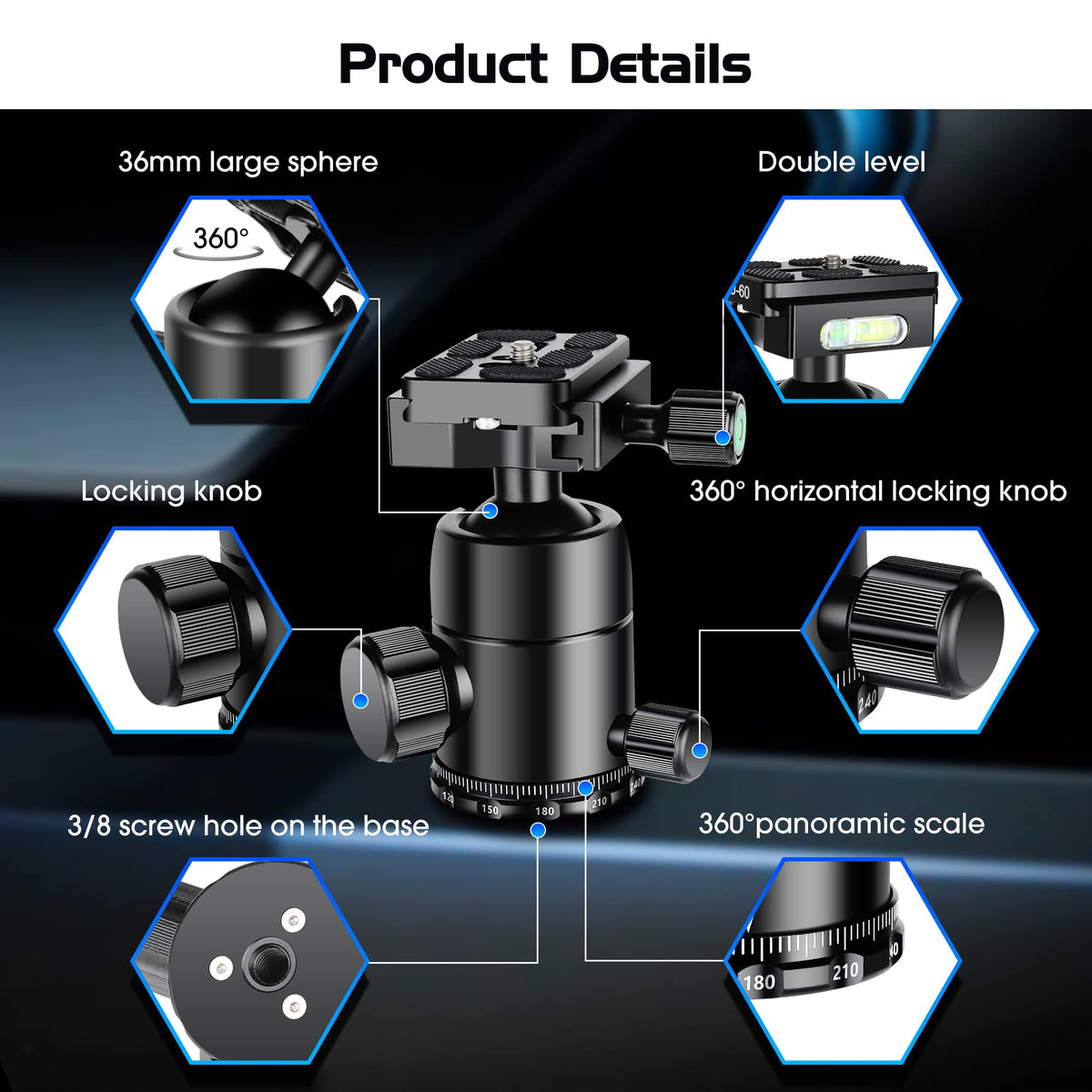 Brand: Manbily Model: Ball Head B-20 Color: Black Material: Metal Aluminum Production Process: Cnc Numerical Control Machining Ball Diameter: 36Mm Height: 105Mm Weight: 0.92 Lbs/420G Maximum Load: 33 Lbs/15Kg Quick Release Shoe: 60 X 38Mm, 1/4 Inch Screw (With 3/8 Screw Conversion) Screw Hole At The Bottom: 3/8 Inch (With 1/4 Screw Conversion)