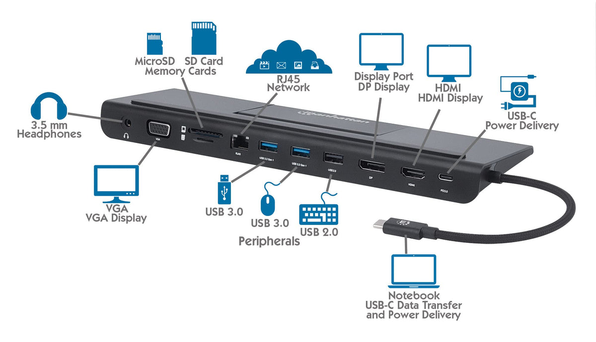 Q: What ports are available on the Manhattan USB-C Docking Station?A: The docking station includes HDMI, DisplayPort, VGA, three USB 3.2 Gen 1 Type-A ports, one USB 2.0 Type-A port, a USB-C Power Delivery port, a Gigabit RJ45 Ethernet port, an SD Card Reader, and a 3.5 mm audio port for versatile connectivity.