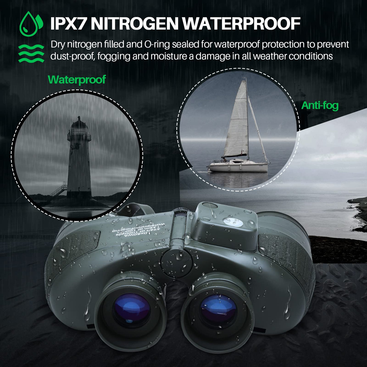 Q: Are these binoculars waterproof and fogproof?A: Yes, these binoculars are both waterproof and fogproof, ensuring they can withstand harsh weather conditions. They are sealed with O-rings and filled with nitrogen gas to prevent moisture from entering, making them reliable for outdoor activities like hunting and boating.