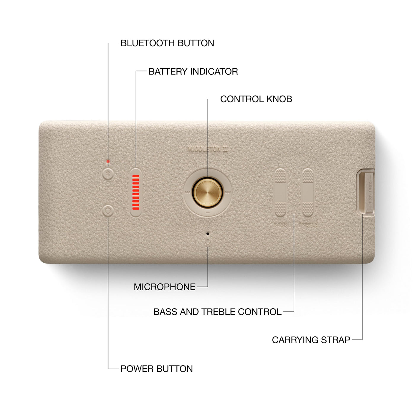 Put Your Playlist Through Its Paces. Featuring 30+ Hours Of Portable Playtime And A Durable Build, Middleton Ii Prefers Life On The Road. With 360 Sound Thanks To True Stereophonic, You Wont Miss A Beat From Anywhere You Stand. Adjusting The Bass And Treble Is Also Simple Thanks To The Marshall Bluetooth App And Tactile Controls On The Top Panel Of Your Speaker.