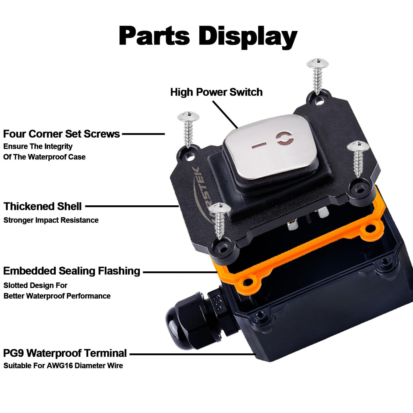Q: Is the inline cord switch waterproof?A: Yes, the inline cord switch features IP67 waterproofing, making it suitable for outdoor use and protecting against water exposure.