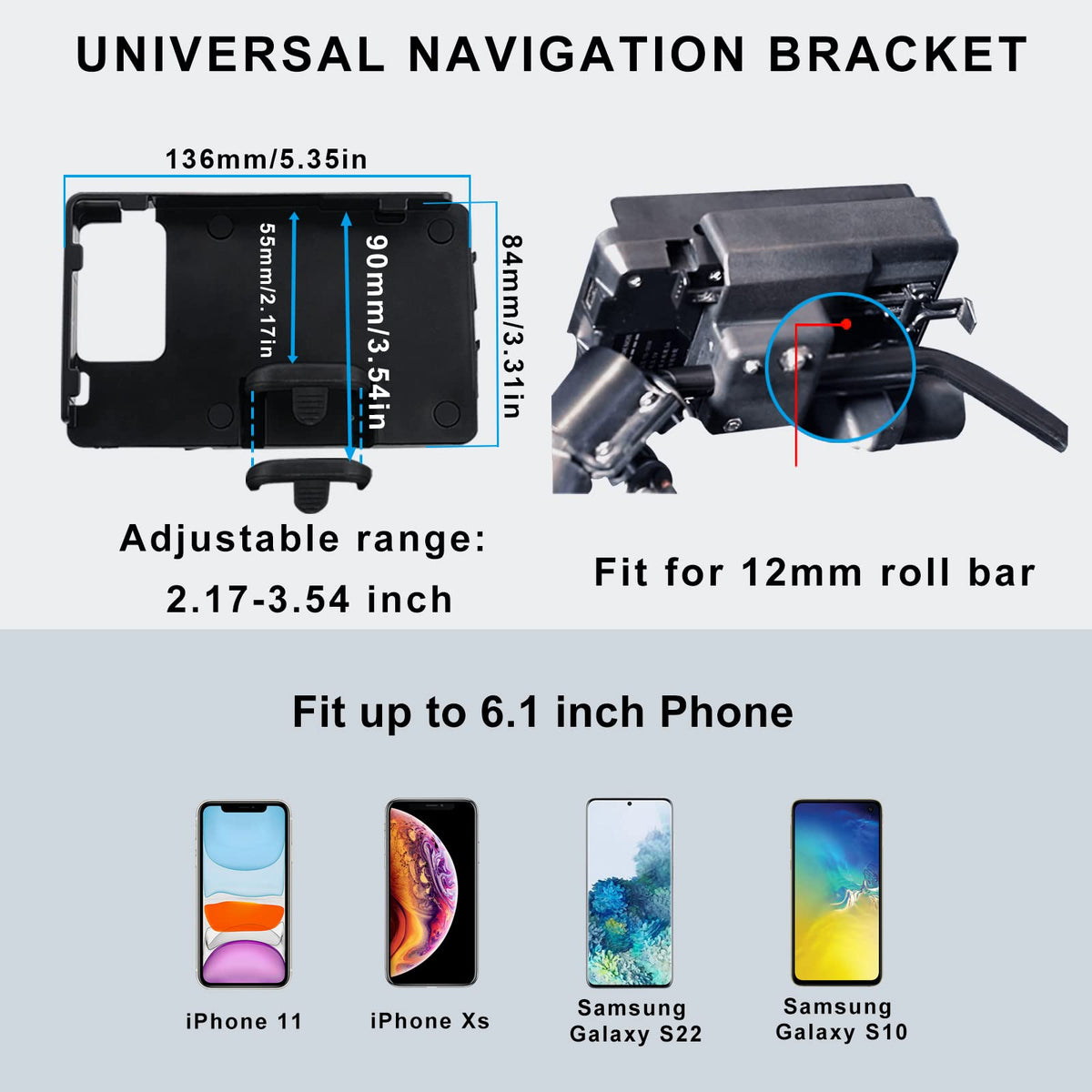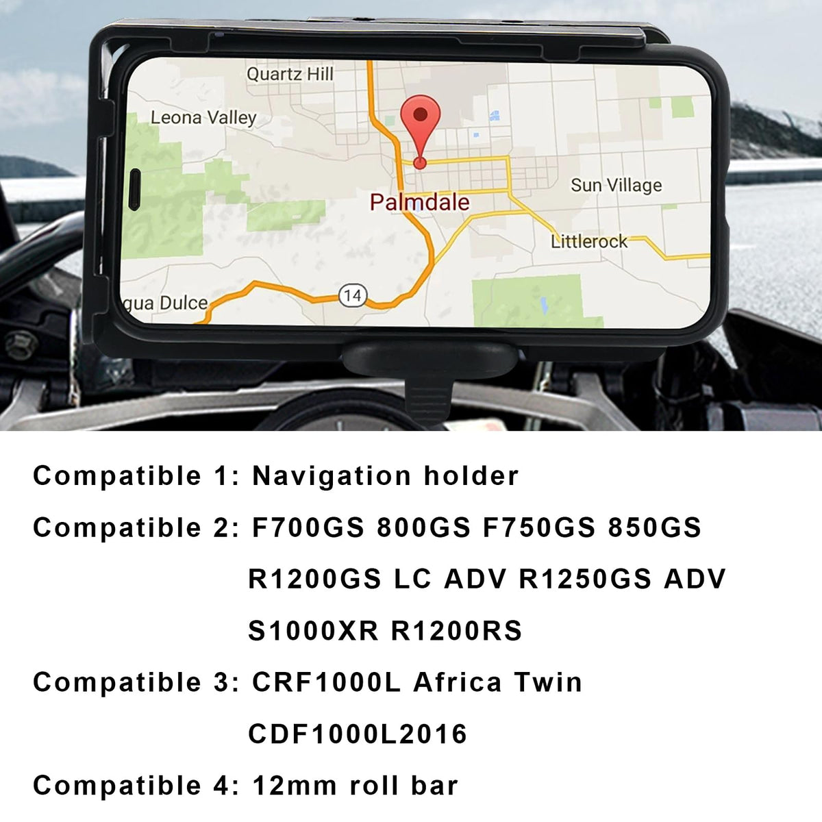 Fitment(Please Note:The Phone Holder Mount Do Not Compatible With Iphone 12/12 Pro ) ---Compatible With F700Gs F800Gs ---Compatible With R1200Gs Adv ---Compatible With Crf1000L Africa Twin Crf1000L 2016 ---For G.A.R.M.I.N Navigation Holder ---For 12Mm Roll Bar Package Include --- 1 * Usb Mobile Phone Bracket Stand --- 1 * Pair Of Splints --- 1 * External Power Cord --- 4 * Screws Features Premium Material-----Motorcycle Phone Mount Is Made Of Excellent Abs Plastic, Wear-Resistant And Waterproof. Stable & Safe-----The Phone Mount Adopts Three-Sided Clip Design, The Phone Doesn'T Wobble Or Sway Even While Riding. Usb Charger-----This Motorcycle Phone Holder Has Usb Charger To Keep Your Mobile Or Gps Devices Charged Anytime When You Need. Perfect Design-----The Button On The Side Of Phone And Phone Mount Has A Gap To Avoid The Squeeze Of The Side Buttons And Phone Camera.