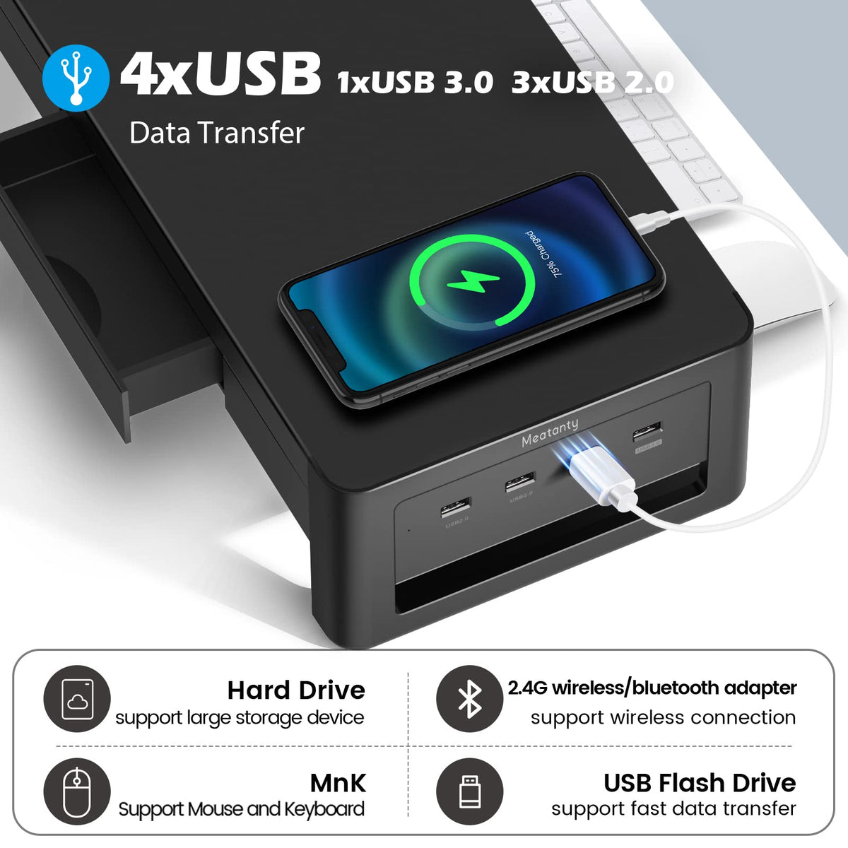 Why Choose The Meatanty Monitor Stand?Extend Pc Connectivitywith 4Xusb Ports, The Meatanty Monitor Stand Lifter Greatly Expands Pc Connectivity. Whether You Are Connecting More Devices To Your Computer Or Your Laptop Has Only One Type-C Port, This Monitor Stand Can Help. (Note: The Usb Interface Is Only Used For Data Transfer, Not Charging).Ergonomic Designergonomic Design For Healthy And Comfortable Posture. Elevated Computer Monitor Provides A Comfortable Viewing Angle And Prevents Neck And Shoulder Pain.Drawer Designtwo Drawer Storage Keeps Your Desktop Tidier. The Monitor Stand Has Two Drawers To Store Pens, Phones, Notes, And Other Office Supplies. The Lower Section Can Hold A Keyboard And Mouse.Sturdy Constructionmade Of High-Quality Galvanized Steel, Measuring 21.5In(L)X7.8In(W)X4.4In(H), It Can Withstand Equipment Weighing Up To 30 Kg.Specifications:Size: 21.5In(L)X7.8In(W)X4.4In(H)Weight: 2.78Kgcolor: Black
